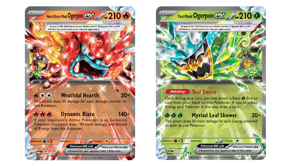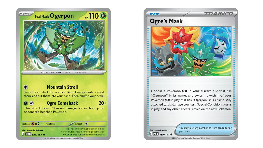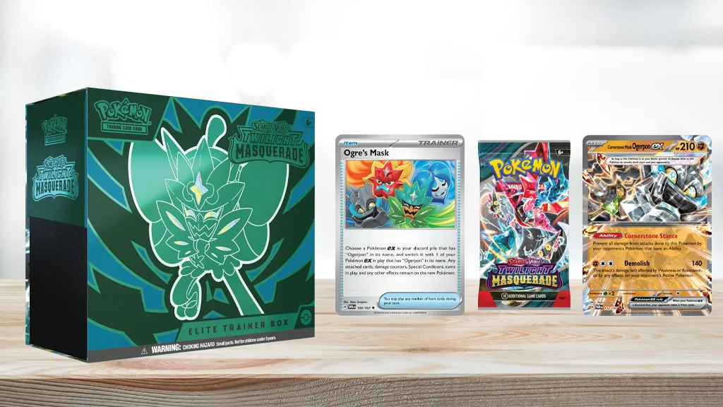 Pokémon Kartaška Igra (TCG) raste! U svibnju vaša obitelj može dodati ekspanziju Scarlet & Violet — Twilight Masquerade svojim bitkama i kolekciji.U novom dodatku možeš pronaći Pokémone koji su originalno predstavljeni u dijelu pod nazivom The Hidden Treasure of Area Zero Part 1: The Teal Mask. Ako nisi upoznat, to je preuzimljivi sadržaj (DLC) za video igre Pokémon Scarlet i Pokémon Violet.Više Pokémona debitira iz DLC-a, uključujući Okidogi, Munkidori i Fezandipiti! Novi TCG dodatak predstavlja Legendarnog Pokémona Ogerpona kao četiri različita Tera Pokémona ex, Voda, Borba i Vatra, na temelju njegovih četiri maske. Igrači mogu boriti s različitim tipovima Ogerpon ex-ova pomoću Ogre’s Mask, nove Item karte. S ovom kartom, budući Pokémon trener može zamijeniti bilo koji Ogerpon ex u igri s Ogerpon ex-om izabranim iz špila.