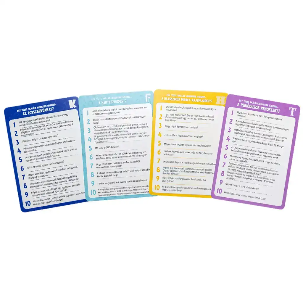 Društvena igra Kvízmérték je zaista poseban kviz, koji ne ispituje samo znanje, već i spremnost timova na preuzimanje rizika. Koliko dobro poznajete različite teme? Osjećate li se dovoljno hrabro da izaberete najteža pitanja i tako osvojite najviše bodova? Ili ste radije na sigurnoj strani? U ovoj igri vi odlučujete koliko ste sigurni u određenu temu – na vrhu skale od 10 čekaju vas najteža pitanja!