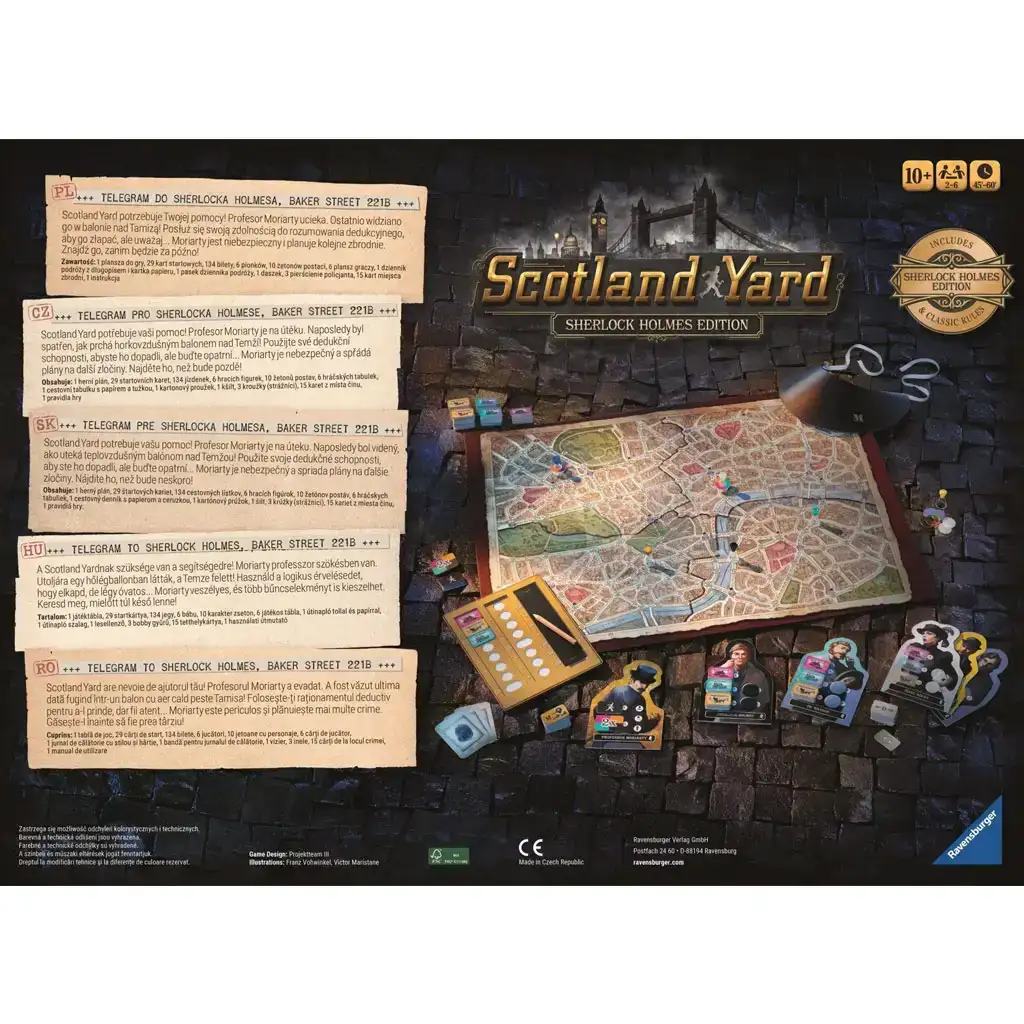 Scotland Yard – Sherlock Holmes izdanje je uzbudljiva društvena igra u kojoj legendarni detektiv Sherlock Holmes i njegovi suradnici pokušavaju uhvatiti zloglasnog zločinca, profesora Moriartyja. Moriarty je u bijegu i posljednji put su ga vidjeli kako bježi balonom na vrući zrak iznad Temze. Sada tim Scotland Yarda, čiji član možeš biti i ti, zajedno radi kako bi ga pronašli prije nego što počini nove zločine.