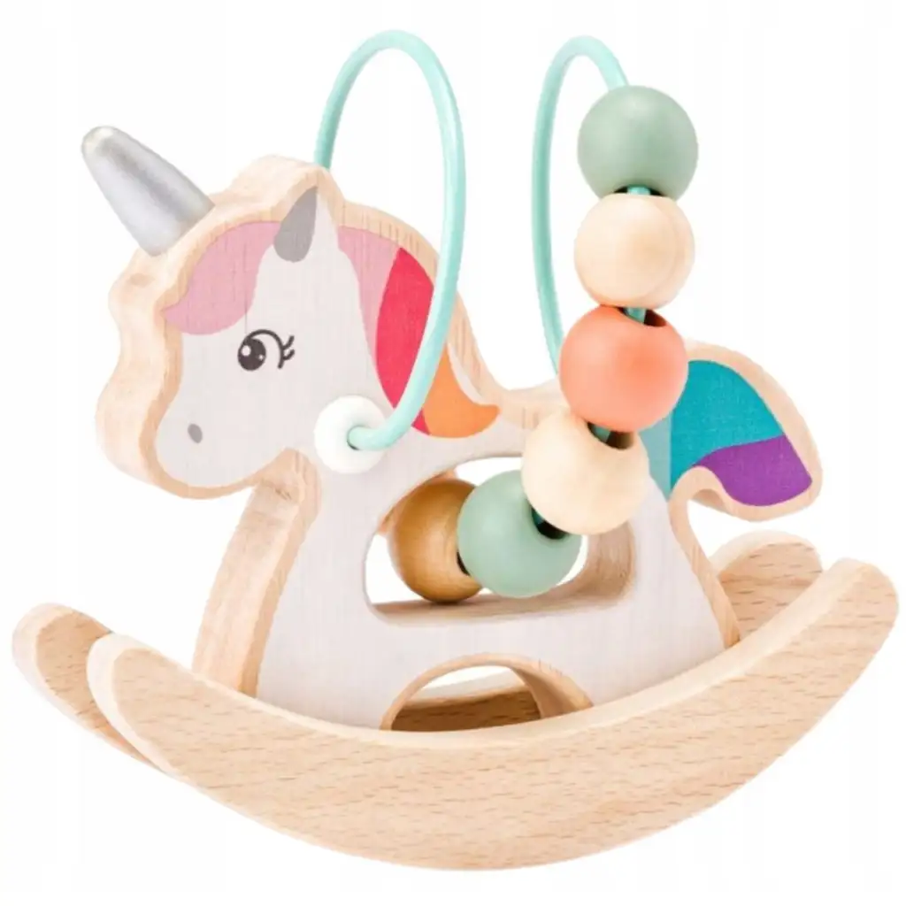 Jednorog s finim linijama, prijateljskim licem i šarenim detaljima odmah privlači dijete. U središtu igre nalazi se drveni jednorog na čijem leđima se mogu voditi šarene kuglice po zakrivljenim žicama. Ove kuglice izvrsne su za razvoj dječje spretnosti, a također pomažu u prepoznavanju boja.