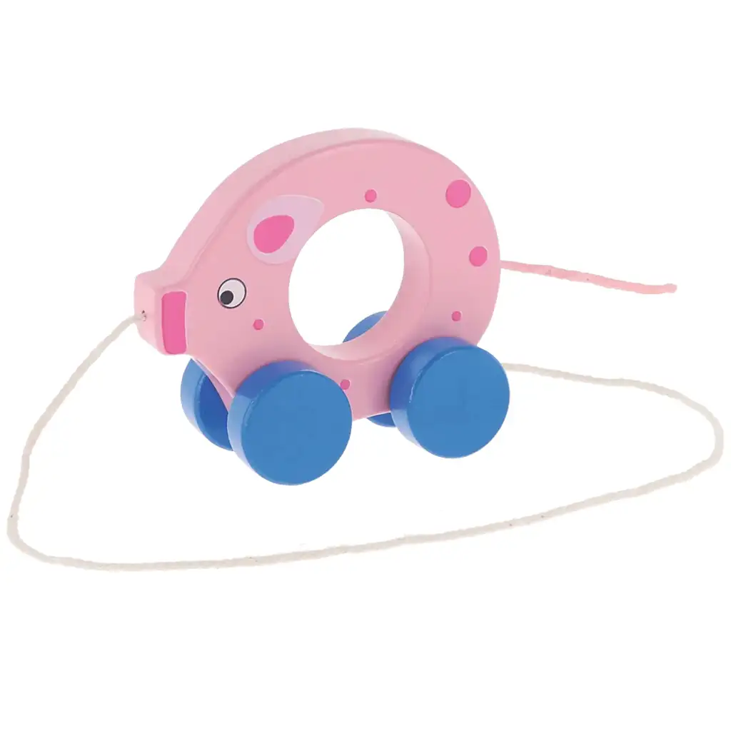 Okrugli otvor u sredini igračke nije samo jedinstveni dizajnerski element, već pruža izvrsnu priliku djeci za vježbanje hvatanja, potičući tako razvoj spretnosti ruku i sposobnosti držanja. Konop za povlačenje idealne je duljine prema preporukama psihologa i omogućuje mališanima da povedu praščića sa sobom u šetnju, što je dodatna motivacija za vježbanje hodanja.