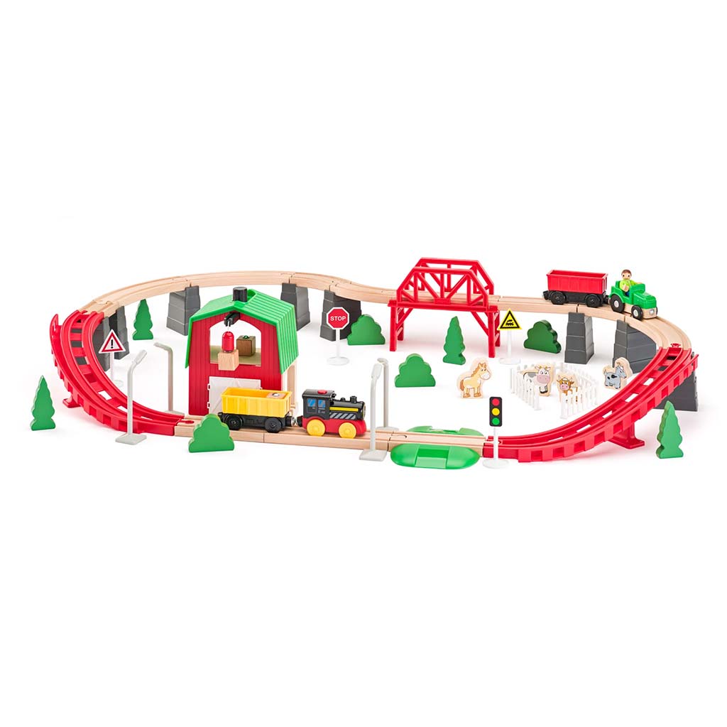 Drvena poljoprivredna željeznička pruga s vlakom i drugim dodacima, set od 60 dijelova, donosi pravu avanturu u dječju sobu. Detaljna staza s temom farme s mostovima, uzvišenjima i zavojima čini igru još uzbudljivijom. Osim lokomotive i vagona, u setu su i traktor, životinjske figurice, drveće, prometni znakovi i šarmantna gospodarska zgrada, pa dijete može iznova stvarati svoje seoske priče.