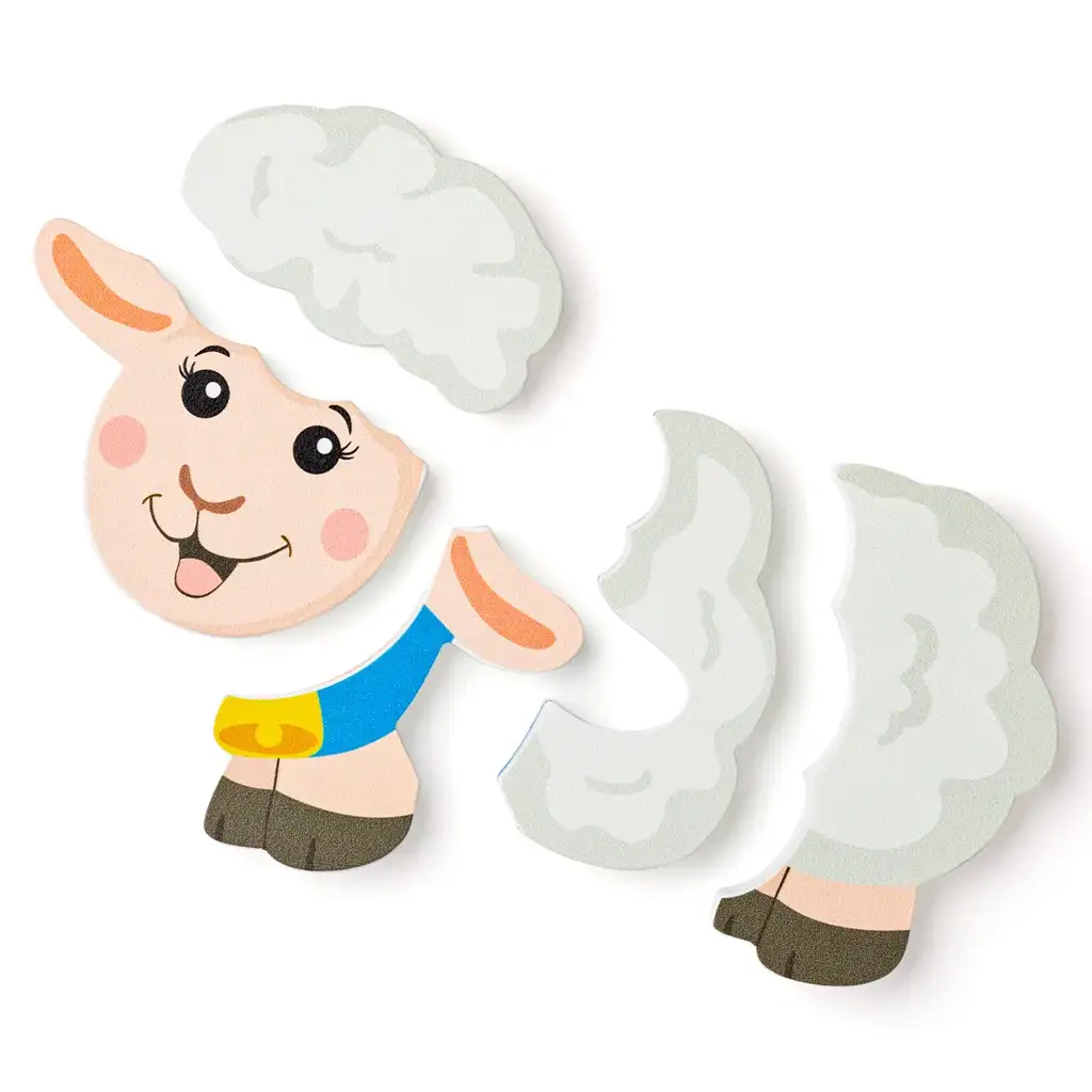 Slatki osmijeh ovčice i prijateljska, šarena pozadina čine ovu igračku posebno privlačnom djeci. Slagalica od pet zasebnih dijelova pomaže mališanima upoznati osnove oblika i slaganja, istovremeno razvijajući koordinaciju ruka-oko i sposobnost koncentracije.