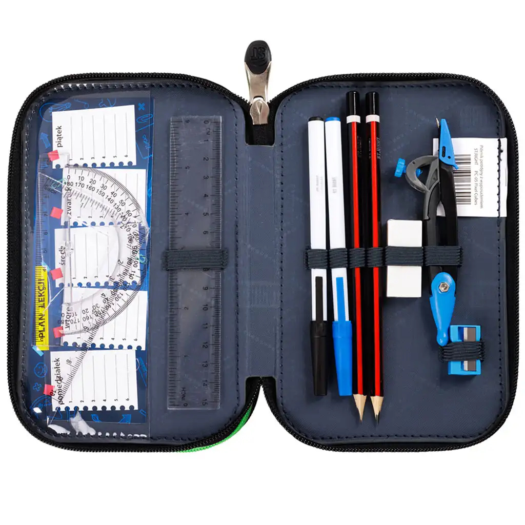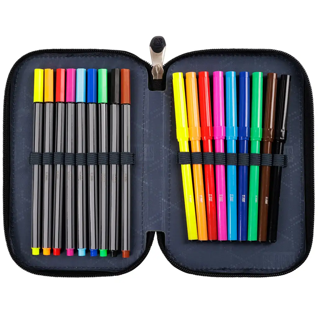 Bogat sadržaj pernice osigurava da je sav potreban školski pribor pri ruci. Sadrži 9 flomastera, 9 bojica, šestar, šiljilo, gumicu, 2 olovke, 2 kemijske olovke, ravnalo i raspored sati. Ovi pribori odgovaraju svim školskim zadacima i kreativnim aktivnostima.