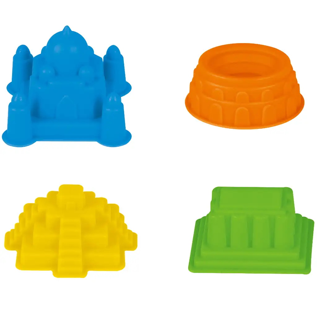 Set za pijesak za pijesak sadrži četiri različita oblika za izgradnju pijeskih dvoraca, svaki u drugoj boji. Ti građevinski elementi omogućuju djeci da izgrade svoje male pijeske dvorce u pijesku.