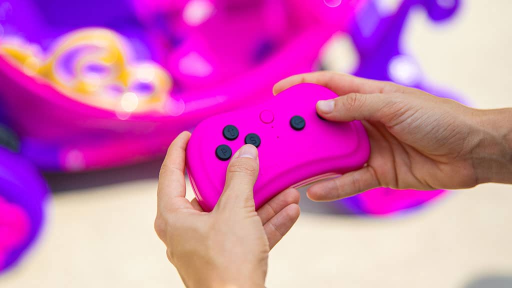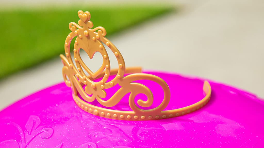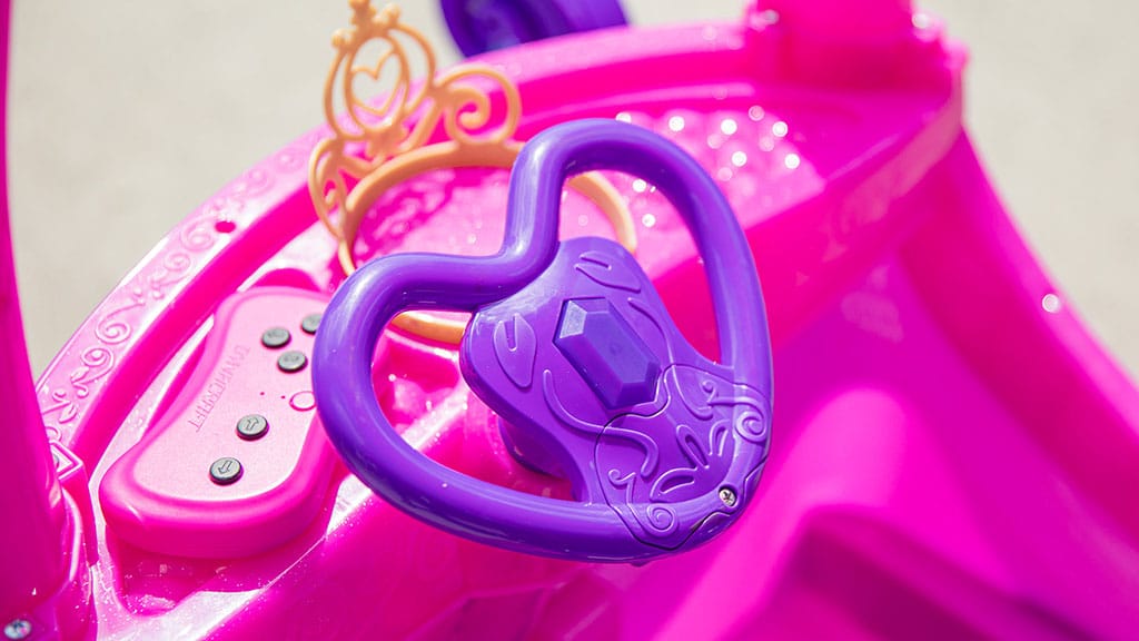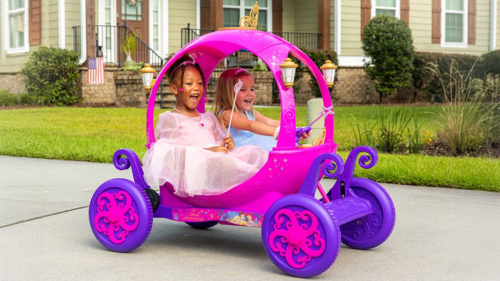 24-voltnu Disney Princeze kočija tvrtke Dynacraft je ružičasto-ljubičasti, sjajni automobil u obliku kočije, koji čine čarobnim filigranske dekoracije, ukrasne svjetiljke i uklonjiva prednja kruna – savršen za igru uloga i ostvarenje snova o princezama.