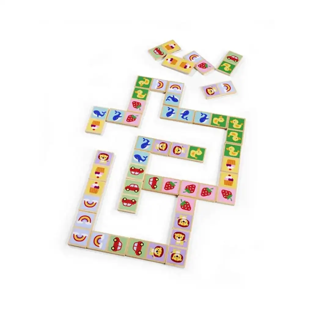 - 28 komada šarenih drvenih domina s dječjim motivima