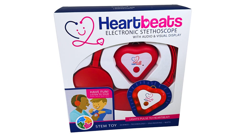 Elektronički stetoskop marke Heartbeats, namijenjen djeci od 5 godina i starijima, novi je pristup medicinskim uređajima za djecu koja se vole igrati doktora. Umjesto tradicionalnih slušalica i zvona stetoskopa, ova STEM igračka dolazi s naglavnim slušalicama i zvonom u obliku srca koje prenosi otkucaje, uključujući otkucaje srca i druge vibracije, u slušalice putem aux kabela. Djeca mogu koristiti Elektronički stetoskop za slušanje vlastitih otkucaja srca, a set uključuje i vodič koji prikazuje druge edukativne aktivnosti koje djeca mogu raditi sa stetoskopom, poput slušanja kućnih zvukova, igranja aktivnosti, navigacije kroz labirinte i još mnogo toga. Set također uključuje narukvicu, tako da djeca uvijek mogu imati elektroničko zvono pri ruci.