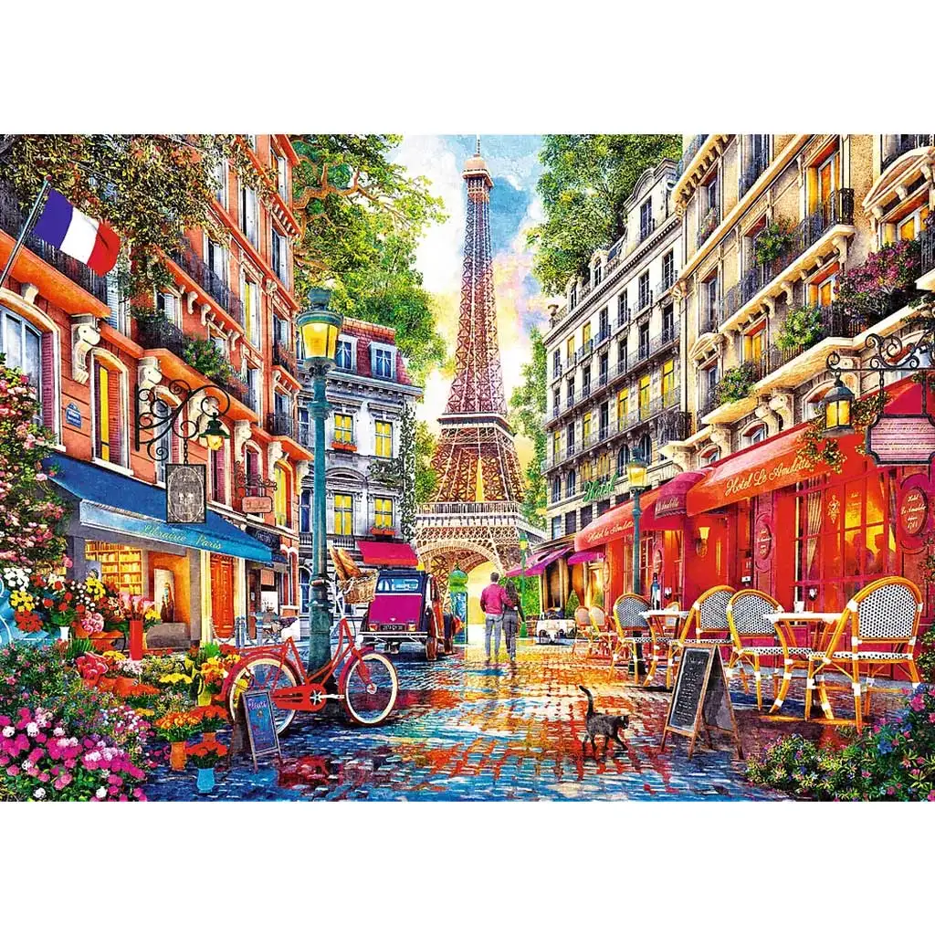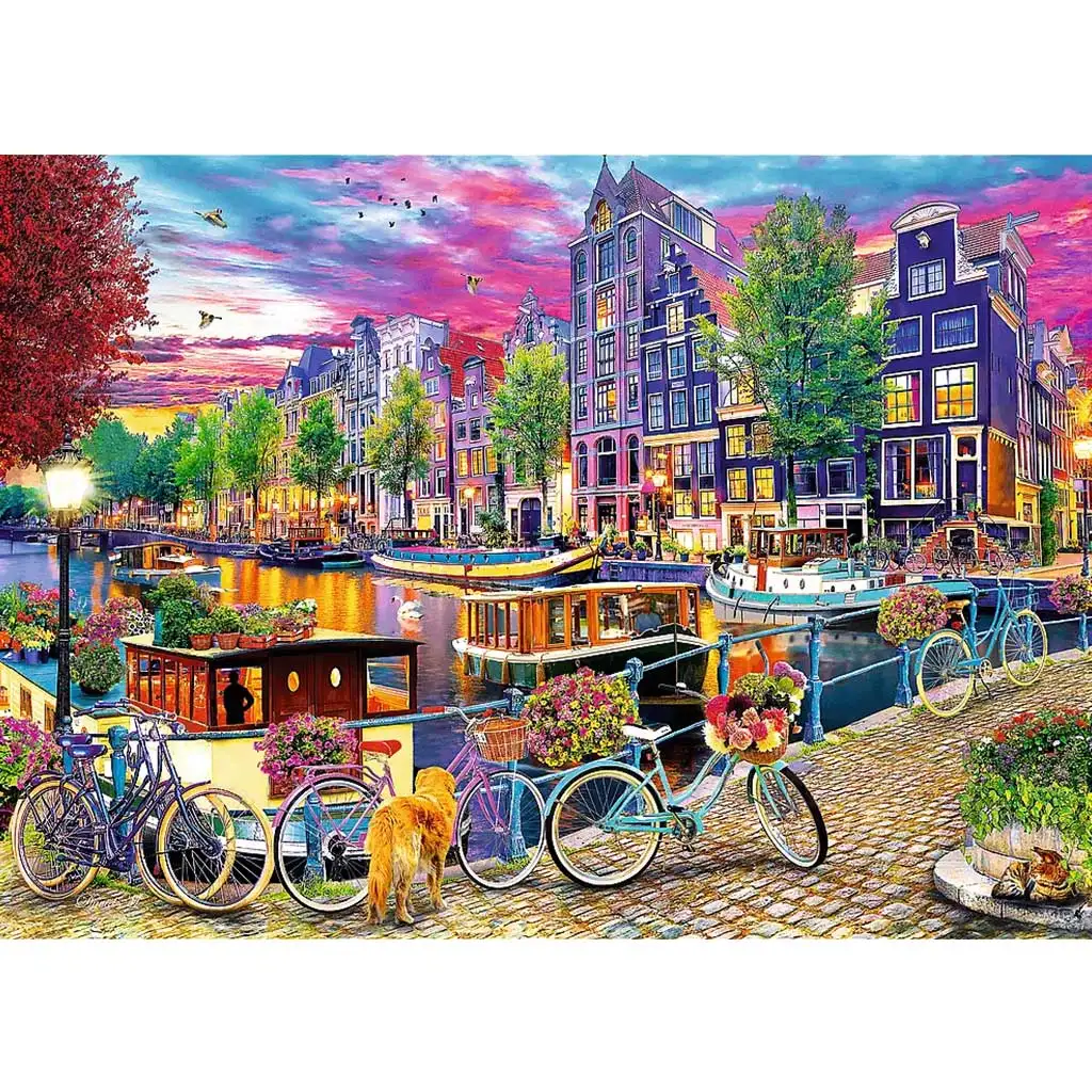Na prvoj slici prikazana je čarobna, popločana ulica Pariza sa Eiffelovim tornjem u pozadini, kafićima, crvenim suncobranima, elegantnim balkonima i šarenim cvjetnim aranžmanima. Druga scena vodi vas uz amsterdamske kanale, gdje možete uživati u opuštenoj atmosferi uz vodu u društvu šarmantnih kuća, bicikala, cvjetnih dekoracija i psa, u svjetlu zalazećeg sunca.