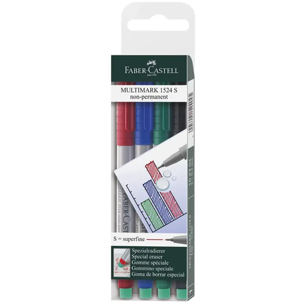 Faber-Castell Multimark set markera za folije s tankim (superfinim) vrhom S savršen je izbor kada su potrebne ekstra tanke i precizne linije na folijama, staklu, metalu ili drugim glatkim površinama. Set od 4 komada sadrži crvenu, plavu, zelenu i crnu boju, zbog čega je svestran za upotrebu u školi, uredu ili za kreativne svrhe. Vodena, nepermanentna tinta lako se briše vlažnom krpom, što ga čini idealnim za privremene bilješke ili ponovno korištenje površina.