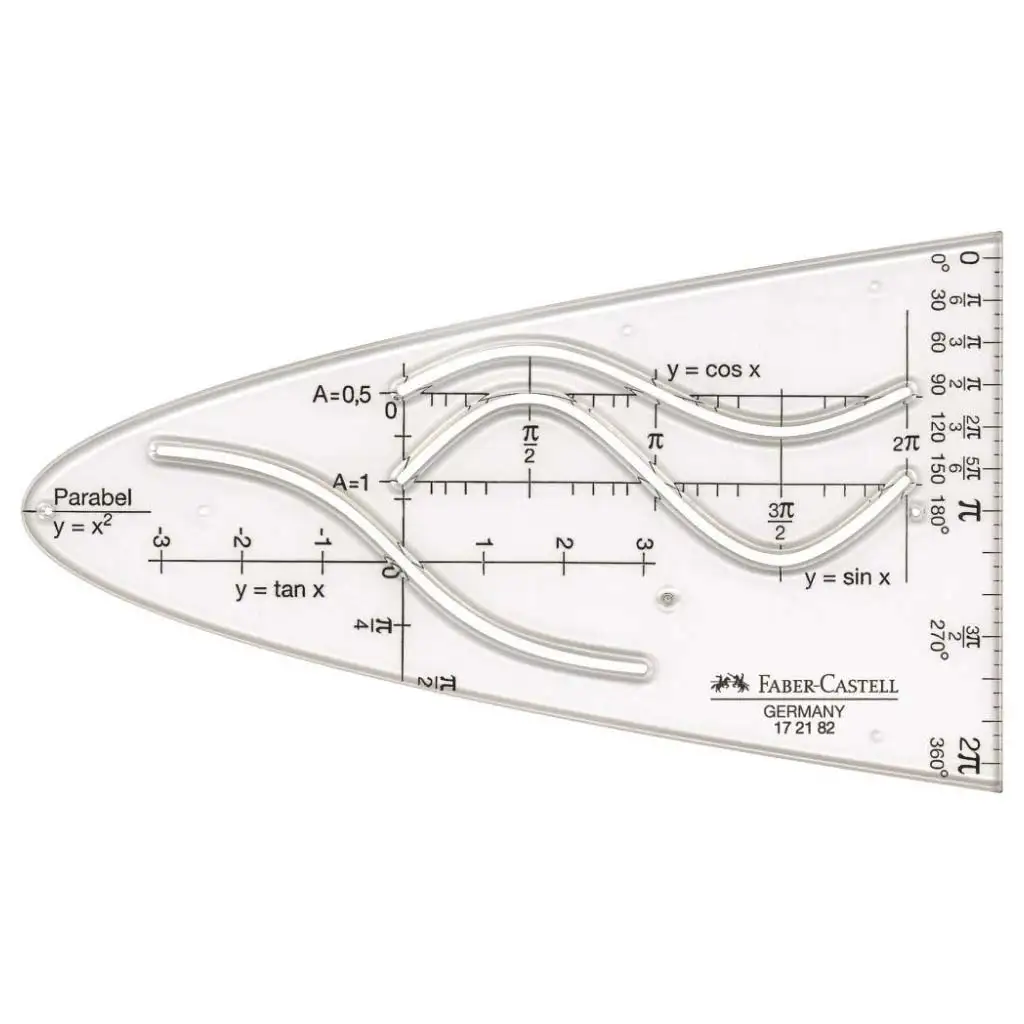Faber-Castell parabolična šablona od 14 cm izvrstan je pomoćni alat za učenike koje zanima matematika, posebno srednjoškolce i gimnazijalce koji se bave grafičkim prikazima funkcija, trigonometrijskim krivuljama ili konstrukcijom jednadžbi. Ova šablona nije pogodna samo za parabolu (y = x²), već i za razne druge važne funkcije poput sinusa (y = sin x), kosinusa (y = cos x), tangensa (y = tan x) i eksponencijalnih oblika, omogućujući precizno, uredno i pravilno crtanje.