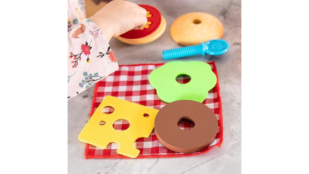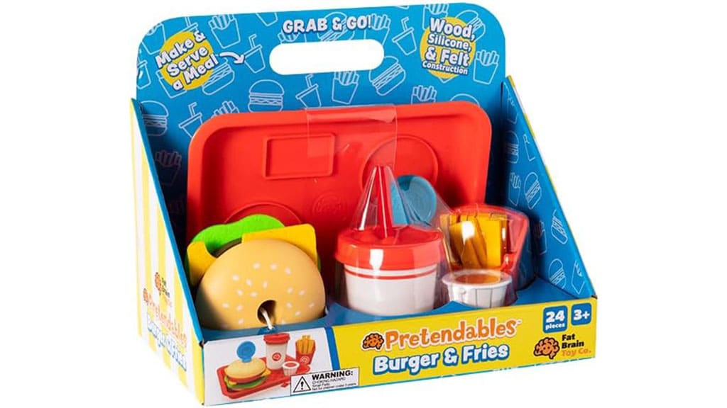 Fat Brain Toys proširio je Pretendables meni s hamburgerima i pomfritom! S ovim setom od 24 dijela, djeca mogu odigrati ulogu pravog obroka i pripremiti ukusno zabavan hamburger. Set sadrži sve potrebne elemente kako bi djeca mogla kreativno i zabavno provoditi vrijeme, dok razvijaju svoju maštu i socijalne vještine. Tijekom igre, djeca mogu naučiti osnove pripreme hrane i uživati u radosti zajedničke igre s prijateljima ili članovima obitelji.