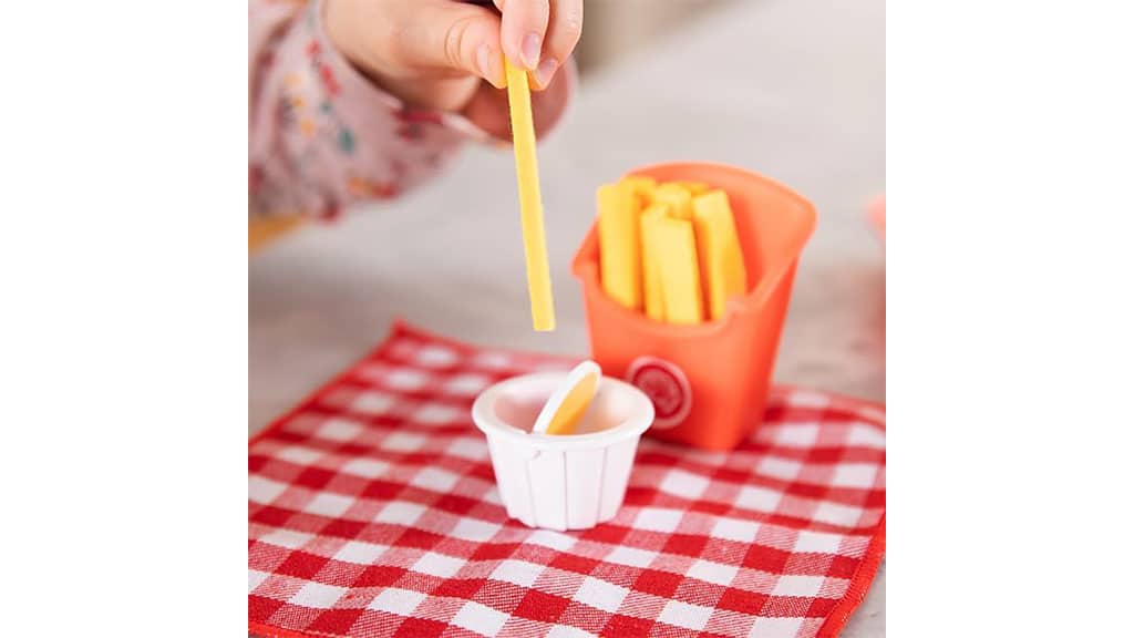 Djeca će obožavati umakati pomfrit od filca u zdjelicu s umakom, koja se izmjenjuje između senfa i kečapa s Pretendables Burger i Fries setom. Ova igra nije samo zabavna, već razvija dječju maštu i fine motoričke vještine. Mogućnost izmjene različitih umaka omogućuje djeci da zamišljaju različite okuse i teksture dok kreativno oblikuju svoj mali svijet tijekom igre.