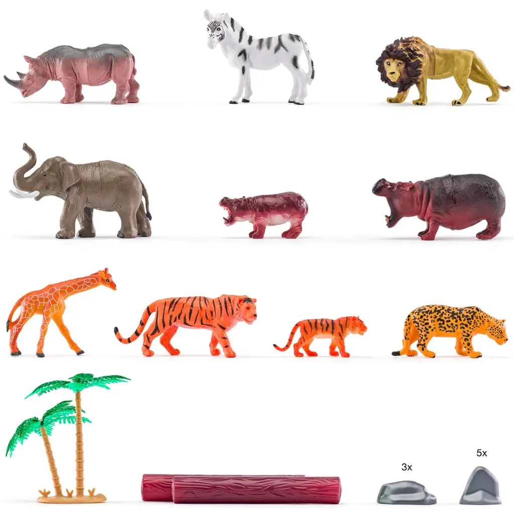 U setu se nalaze najpoznatije divlje životinje, poput snažnog i veličanstvenog lava, brzog geparda, prugastog tigra, ogromnog slona, zebre s posebnim uzorkom i dugovratog žirafe. Ove figure životinja su detaljno izrađene, što ih čini realističnima, pa djeca lako mogu prepoznati i naučiti imena i karakteristike životinja. Plastična stabla i stijene u setu pomažu djeci stvoriti atmosferu divljine, čineći igru još kreativnijom.