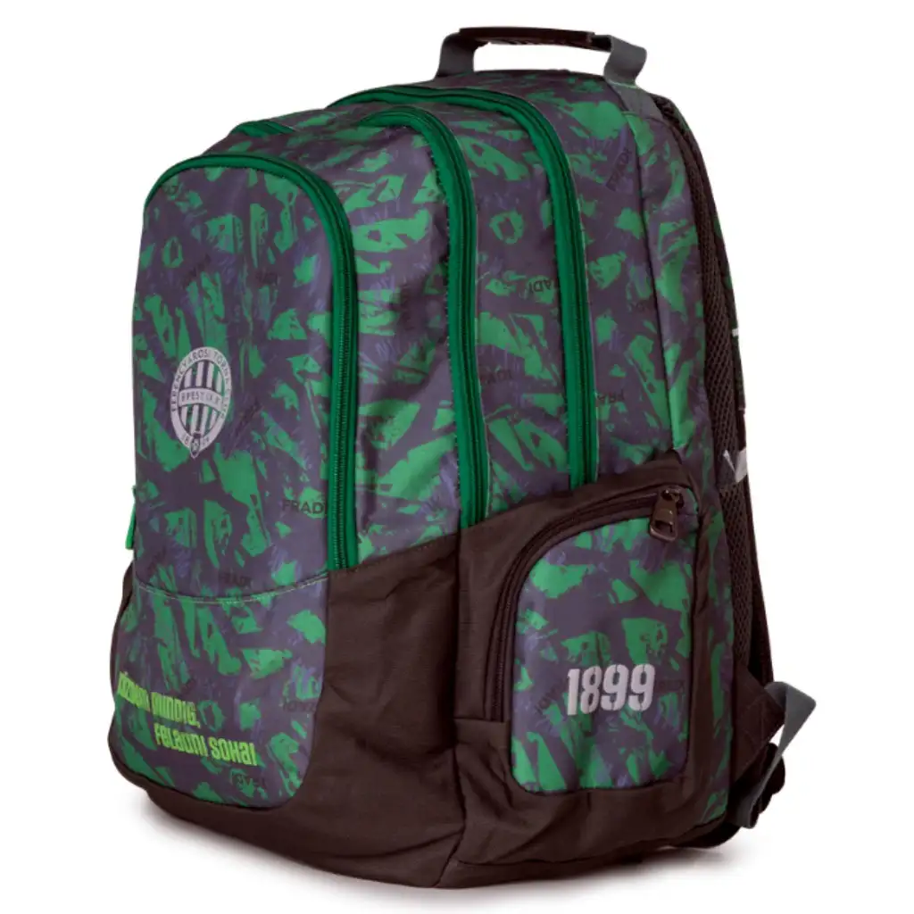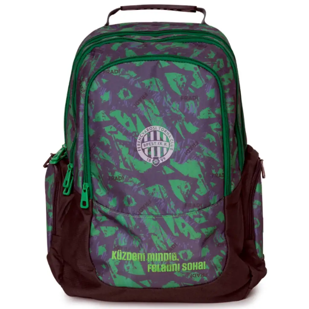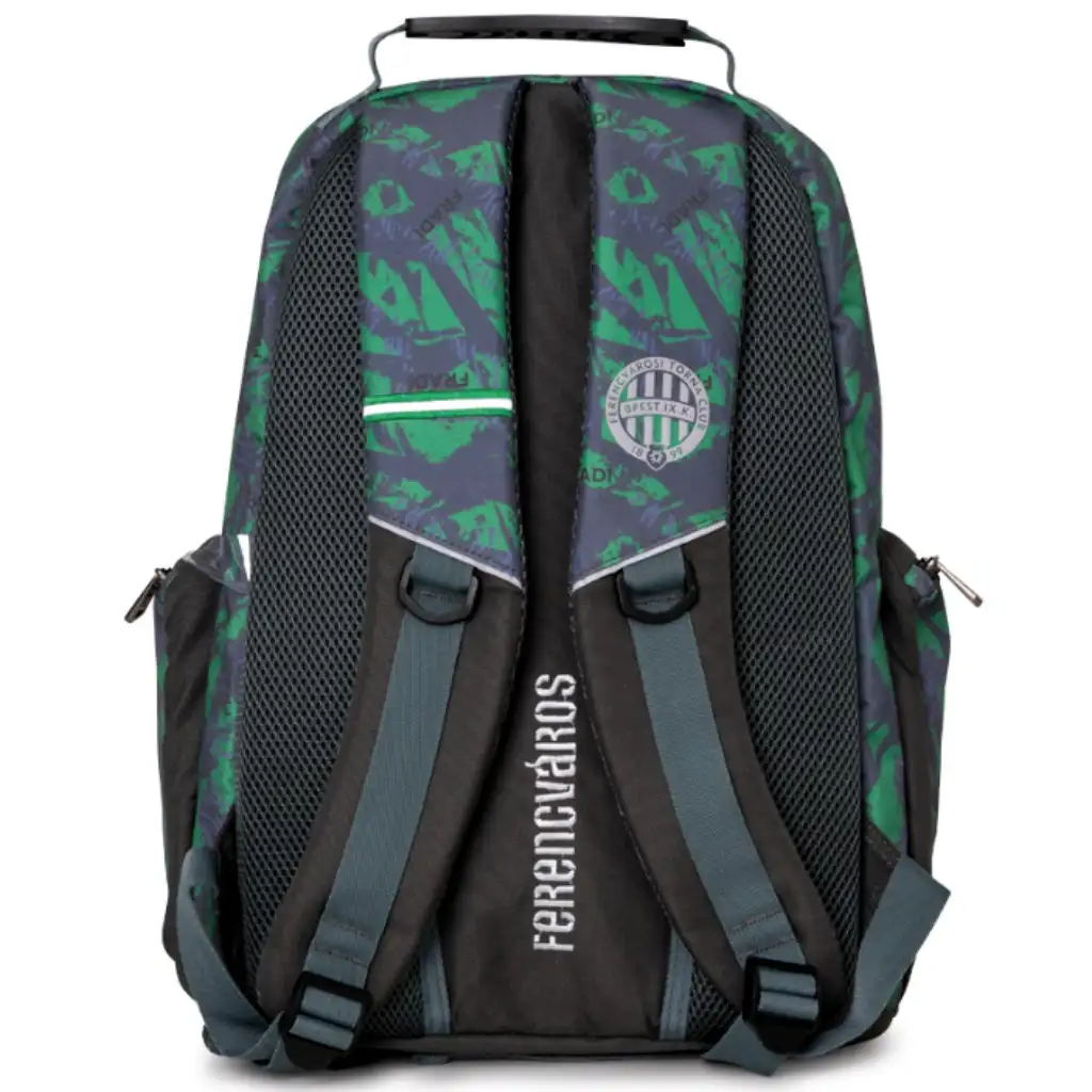 Fradi ruksak srednje veličine s maskirnim uzorkom idealan je izbor za starije školarce koji bi ponosno predstavljali svoj omiljeni tim i tijekom svakodnevnog života. Hrabri zeleni-crni dizajn, natpis "Boriti se uvijek, nikad ne odustati!" i Fradi grb daju torbi zaista jedinstven stil. Zahvaljujući dimenzijama (47 x 40 x 18 cm), u nju se udobno smješta sva potrebna oprema – udžbenici, kutija za užinu, pernica i laptop. Podstavljene, ergonomske naramenice i prozračan stražnji dio osiguravaju udobnost tijekom cjelodnevnog nošenja, čak i tijekom najzahtjevnijih školskih dana.