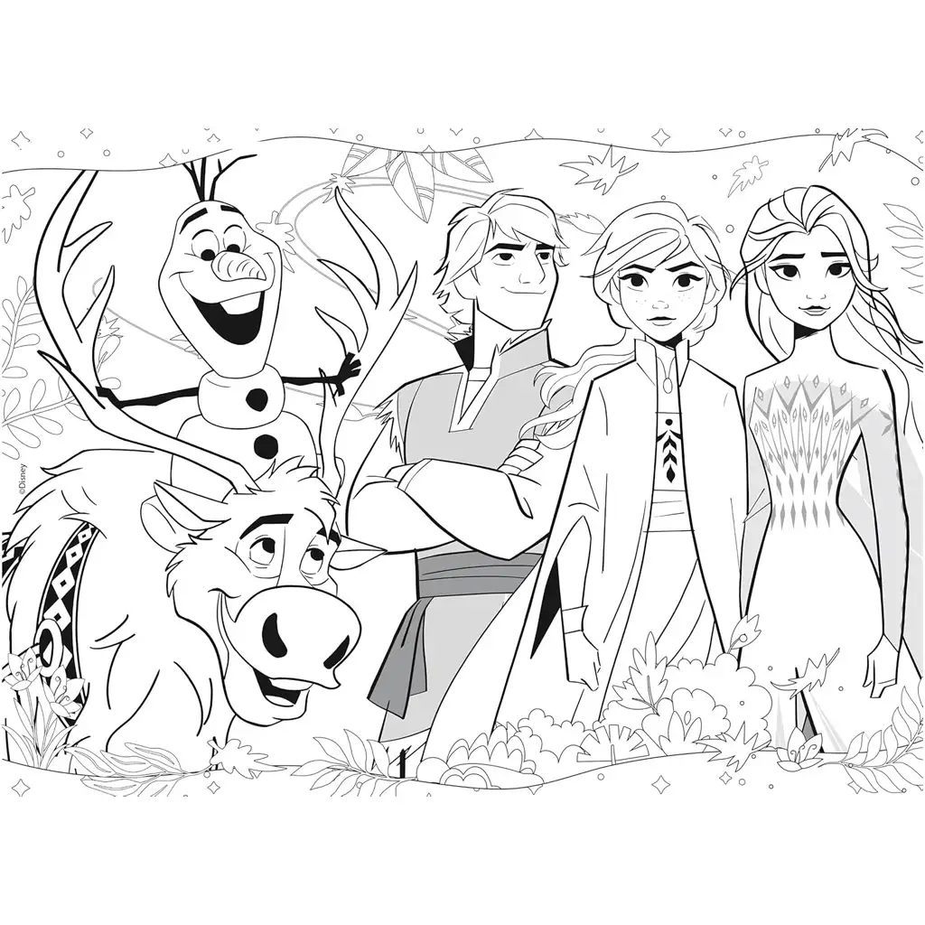 Slagalicu krase prijateljski trenuci Else, Anne, Kristoffa, Olafa i Svena – sve to na jesenskoj, šumskoj pozadini koja u dječju sobu unosi pravi ugođaj i tople boje. Slika savršeno dočarava duh sestrinske povezanosti i želje za pustolovinom, što je karakteristično za priče o Snježnom kraljevstvu. S druge strane nalazi se crno-bijeli prikaz iste scene za bojanje, koji razvija kreativnost i finu motoriku.