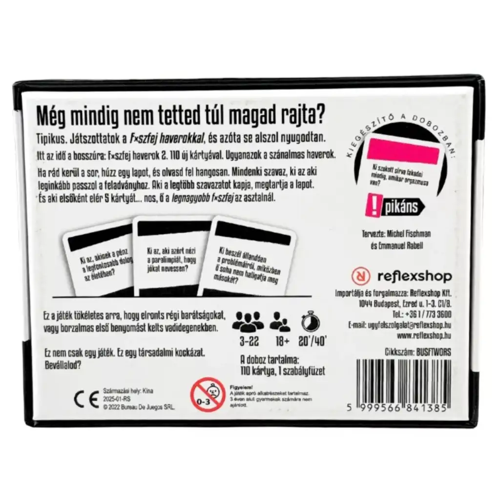 Fxszfej društvo 2 društvena igra – brutalno iskrena, do suza smiješna party igra se vraća, gdje se vaša ekipa ponovno nalazi u centru pažnje. Izvuci kartu, pročitaj pitanje naglas, a onda svi istovremeno pokažu na onoga na koga "najviše paše" opisana situacija. Ovdje nema okolišanja: samo neugodne istine, glasne rasprave i onaj tip smijeha od kojeg te već boli trbuh.
