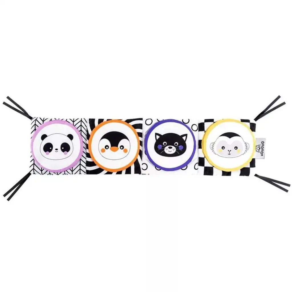 Knjiga je izrađena s kontrastnim crno-bijelim uzorcima i živopisnim detaljima koji su posebno važni za podršku razvoju vida novorođenčadi. Slatke životinjske figure – poput pande, pingvina, mačke i majmuna – pobuđuju interes bebe, potiču koncentraciju pažnje i razvoj koordinacije oko-ruka.