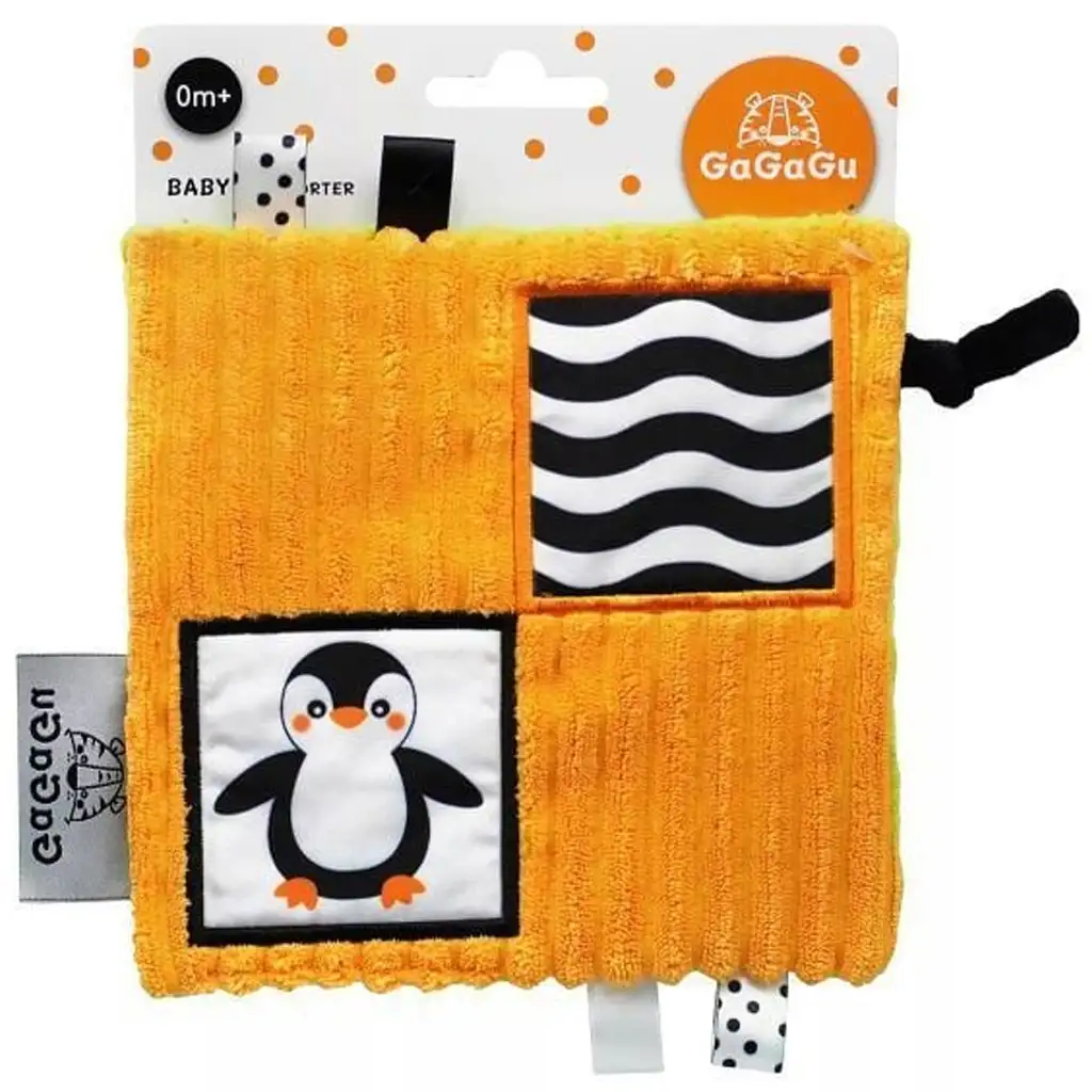 GaGaGu dvostrana senzorna krpica s uzorkom pingvina i rakuna savršena je prva igračka za vašu bebu! Ova mekana tekstilna igračka nije samo umirujuća za grljenje, već također pomaže u senzornom razvoju mališana. Različite teksture, kontrastni uzorci i etikete potiču bebu na igru, dok razvijaju njezine taktilne, vizualne i fine motoričke vještine.