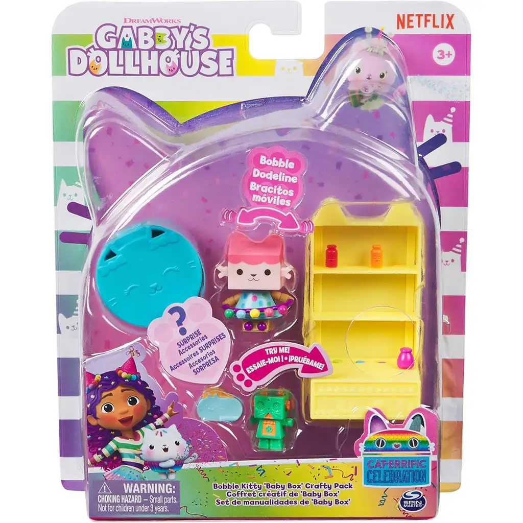 Učinite vrijeme igre vašeg djeteta posebnim s Gabi party namještajem s iznenađujućim dodacima, koji vas vodi u uzbudljiv svijet Gabi kućice za lutke! Ovaj slatki set dolazi s Baby Boxom, kreativnim malim medvjedićem, koji je spreman za zabavnu zabavu. Set uključuje šareni sustav polica za pohranu dodataka i ukrasa, kao i tajnu kutiju koja skriva iznenađenja. Paket uključuje Baby Box figuru s pokretnim rukama, što olakšava oživljavanje igre. Osim toga, slatki dodaci poput mini robota, smiješnih naočala i simpatičnog ukrasnog elementa upotpunjuju zabavnu atmosferu. Dječja mašta dodatno se potiče jer mogu smišljati vlastite priče s ovim setom, dok razvijaju svoju kreativnost i spretnost. Savršen dodatak Gabi kućici za lutke, donosi još više zabave i otkrića za mališane!