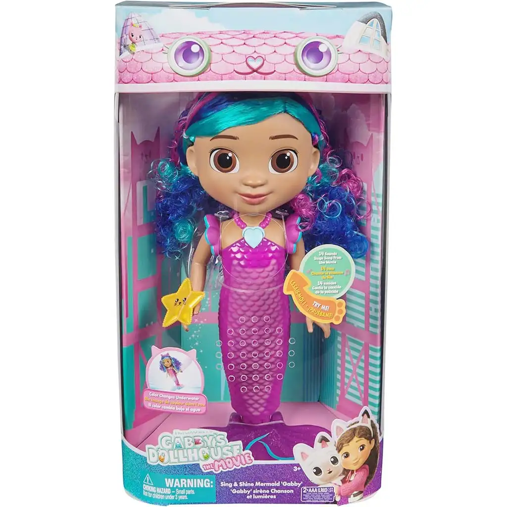 Gabina kućica – Kino: Pjevajuća i svjetlucava sirena Gabi donosi čarobno iskustvo u dječju sobu, izravno iz svijeta popularnog crtića. Ova posebna lutka sirena Gabi nije samo prekrasna, već je i interaktivna: pjeva, svijetli i tijekom igre stvara pravu bajkovitu atmosferu. Sjajni, mijenjajući rep sirene odmah privlači dječju pažnju, posebno kad pod utjecajem vode postane još upečatljiviji.