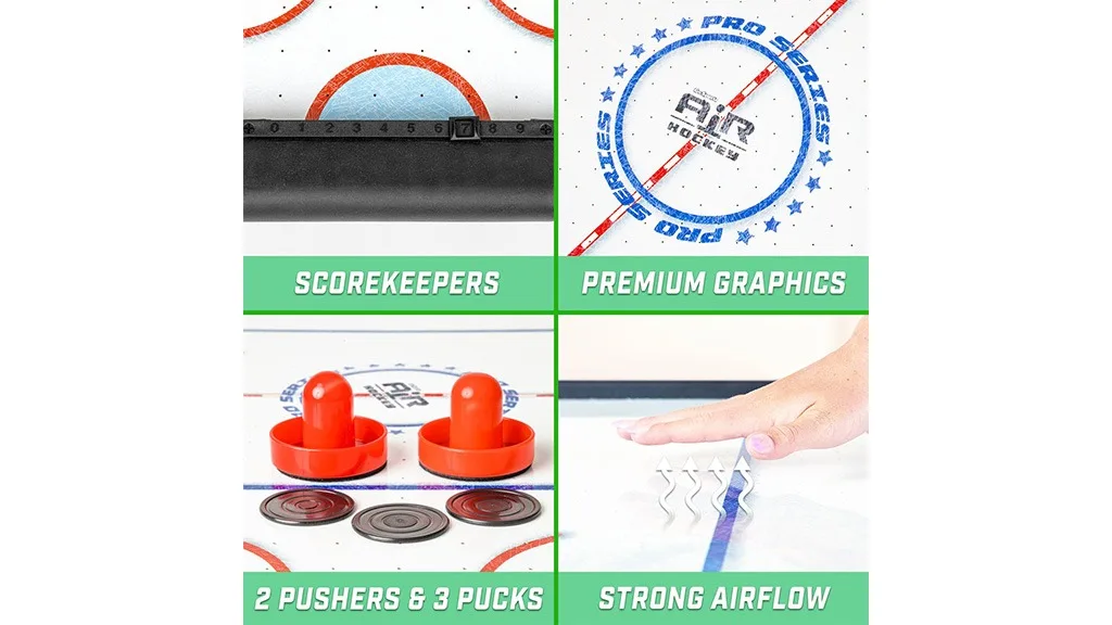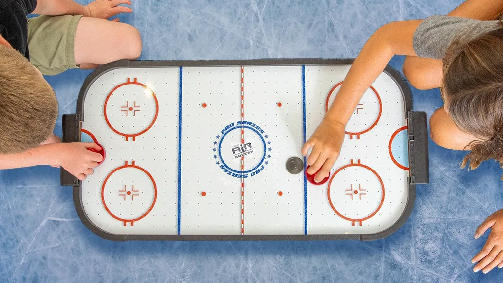 Igra ima stol s dizajnom ledenog terena, s unaprijed instaliranim ventilatorom za glatko igranje i lako hvataljke. Djeca starija od 6 godina mogu poboljšati svoje fine motoričke vještine i razvijati socijalne vještine igrajući ovu klasičnu igru s prijateljima i obitelji. Unaprijed sastavljena ploča savršena je za mobilnu zabavu i može se igrati na bilo kojoj ravnoj površini.