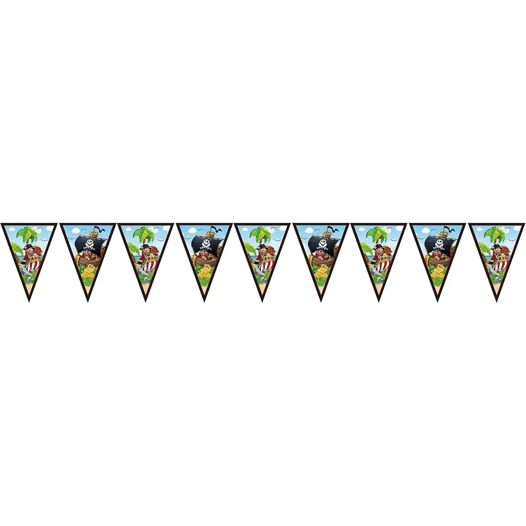 Oplovi sobu najveselijim gusarskim ukrasom! Gusarska Pustolovina Zastavice su savršen izbor ako želite stvoriti zaista ugodnu, tematsku rođendansku proslavu za dijete. Ovaj šareni i uzbudljivi niz prikazuje hrabre gusarske kapetane, otoke s palmama, škrinje s blagom i klasične gusarske brodove, tako da sa svakom zastavicom unosite djelić gusarskog svijeta na mjesto proslave.