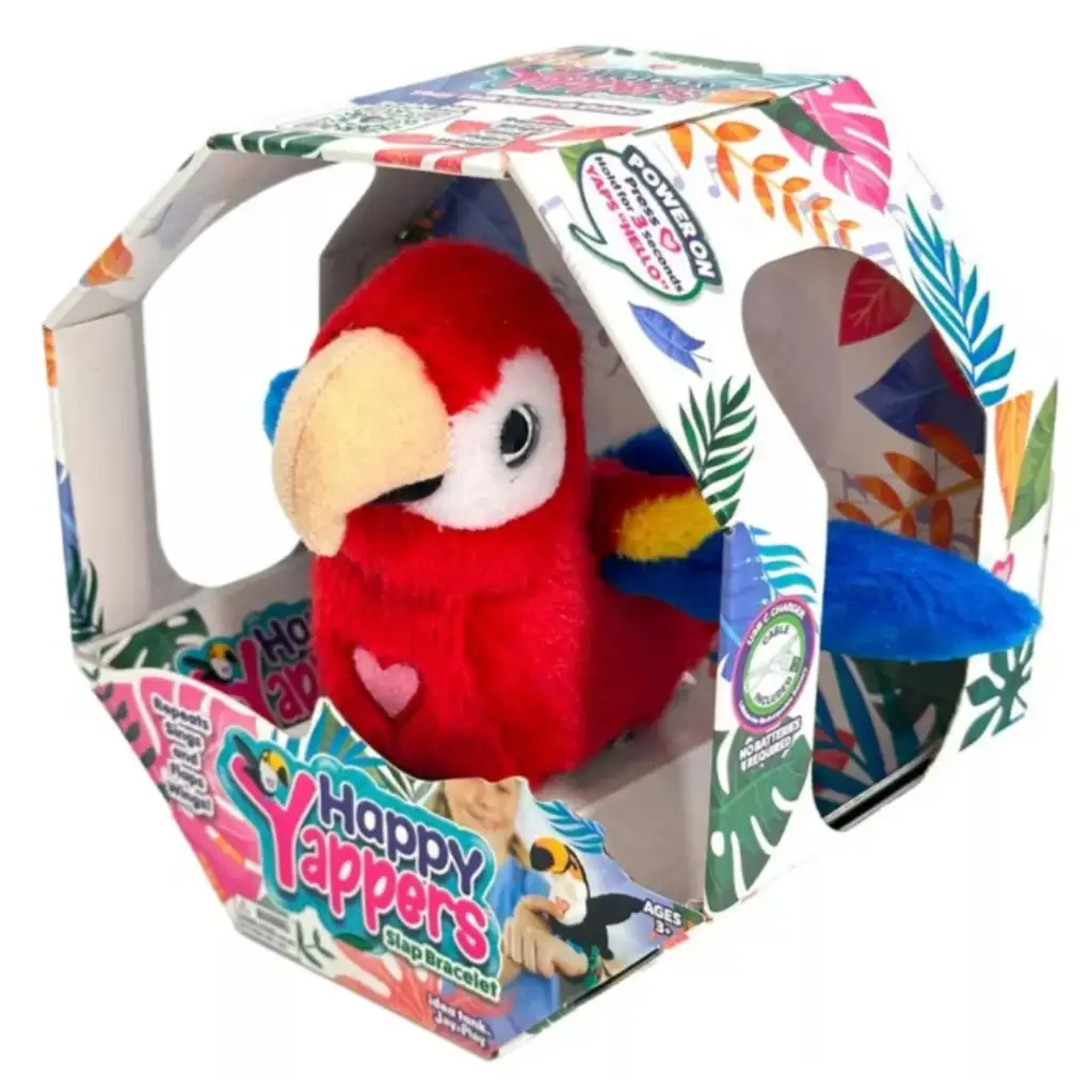 Happy Yappers interaktivna plišana crvena papiga je vesela i posebna igračka koja potiče dječju maštu na igru! Samo zakopčaj papigu oko zapešća šarenom slap narukvicom i papiga će uvijek biti s tobom. Pritiskom na srce na njenim prsima, papiga počinje ponavljati, pjevati, mahati krilima, a čak može i „razgovarati“ s drugim Happy Yappers figuricama! Igračka zabavlja smiješnim zvukovima i pokretima, tako da se djeca lako mogu prepustiti svijetu igre. Idealan je izbor za poklon jer je istovremeno plišana figura i interaktivni prijatelj koji će svaku pustolovinu učiniti uzbudljivijom. Neka Happy Yappers crvena papiga poleti u vaš dom i neka počne vesela, zajednička igra!