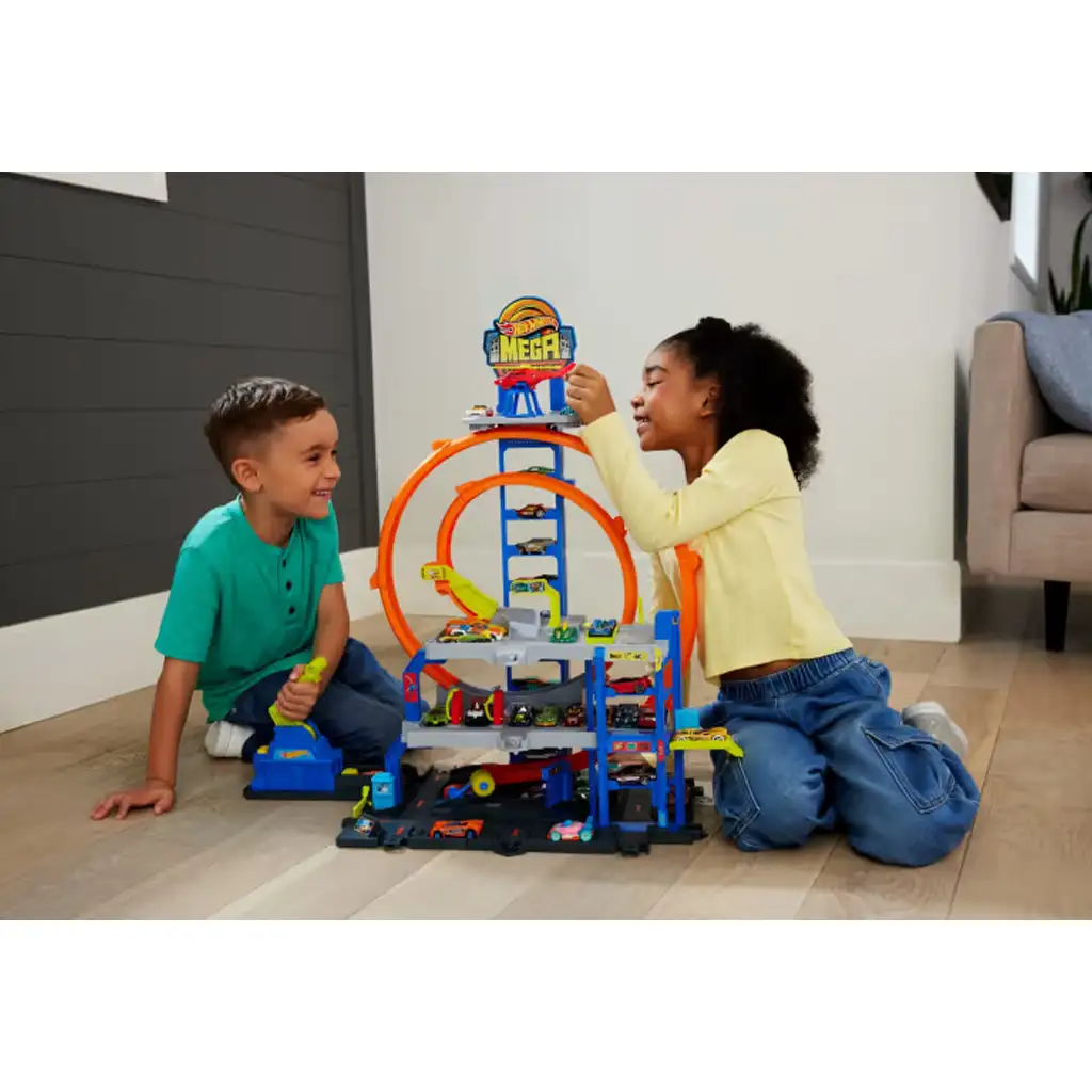 Pripremi se za uzbudljivu i dinamičnu igru u kojoj se brzina, kreativnost i užitak natjecanja spajaju! Hot Wheels City: Mega Garaža je pravi garažni san za sve male ljubitelje automobila. Sa svojom tornjastom strukturom visokom više od 65 cm i dvostrukim loopovima, satima će zabavljati djecu. Ova garaža nije samo parkiralište, već cijeli Hot Wheels pustolovni grad, gdje se auti voze dizalom, jure, vrte i ponovno vraćaju na stazu za utrke.
