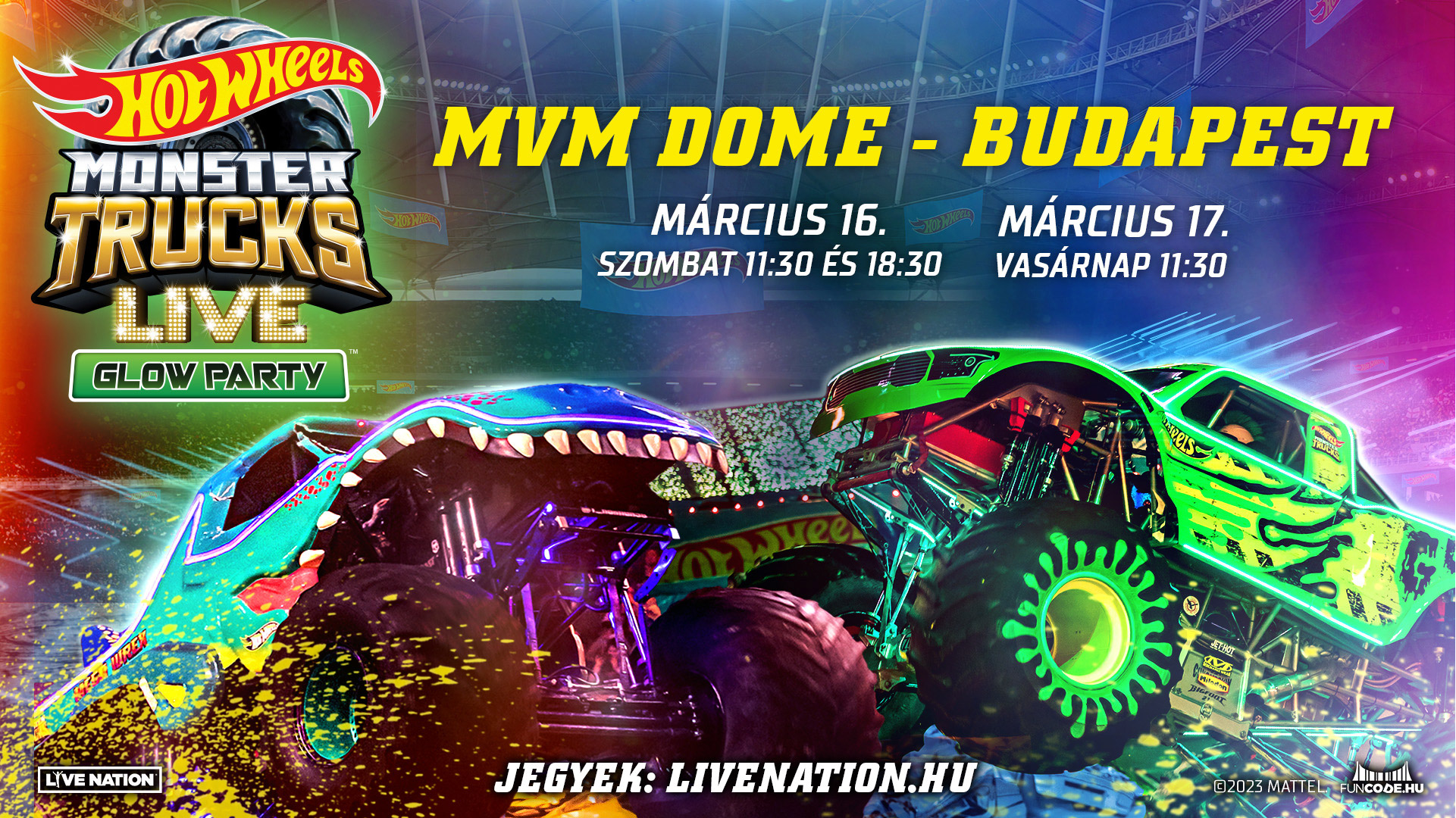 Hot Wheels Monster Trucks Live Glow Party dolazi i u Budimpeštu! Obožavatelji svih dobnih skupina mogu doživjeti uzbuđenje dok navijaju za svoje omiljene Hot Wheels Monster vozila U MRAKU! Ova jedinstvena predstava posjetit će MVM Dome 16. i 17. ožujka 2024., samo za tri izvedbe!