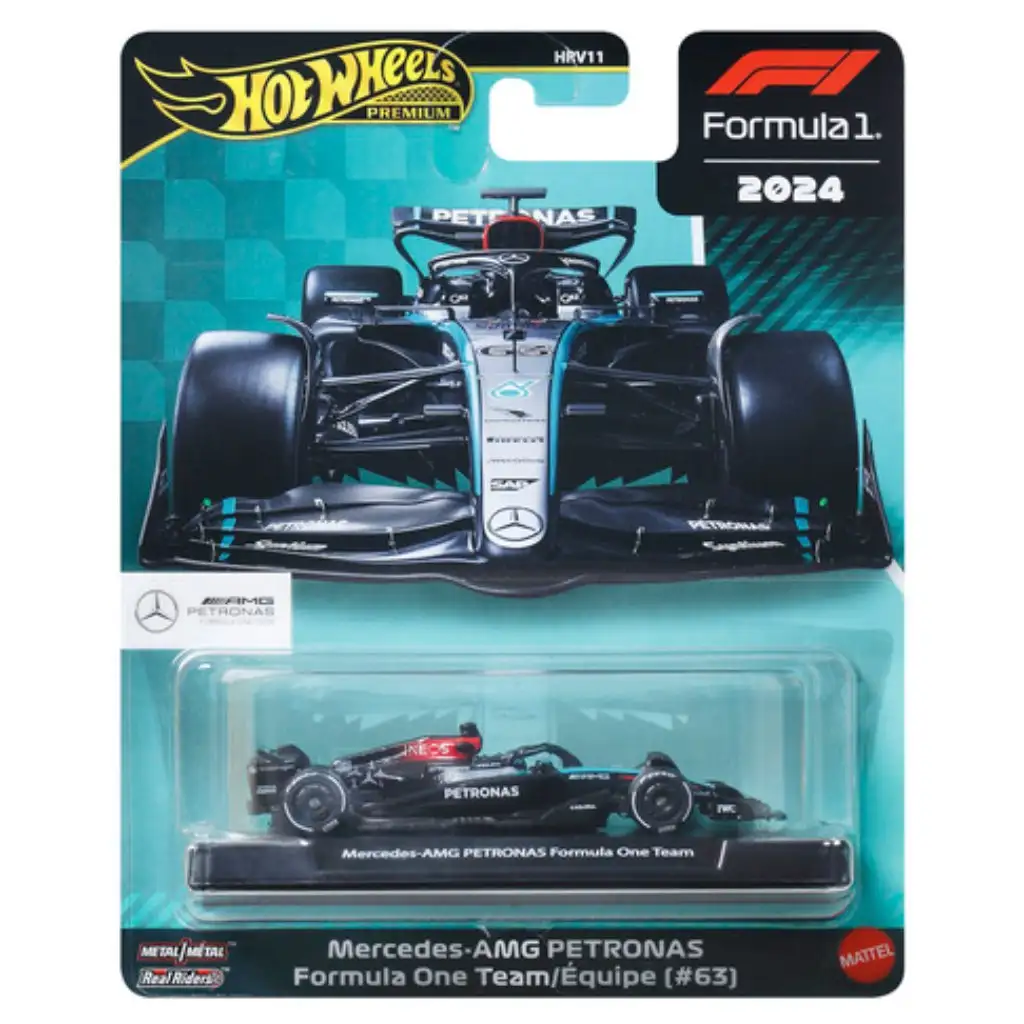 Kao dio Hot Wheels Premium serije dolazi model Mercedes-AMG PETRONAS Formula 1 Team No. 63, koji predstavlja jedan od najpoznatijih trkaćih automobila iz sezone Formule 1 2024. Prepoznatljivo crno-tirkizno timsko bojanje, detaljna grafika sponzora i precizno izrađeni aerodinamički elementi vjerno odražavaju ikonski izgled Mercedesovih bolida Formule 1. Dinamične proporcije i precizna izrada modela pružaju pravi premium doživljaj zaljubljenicima u motorsport.