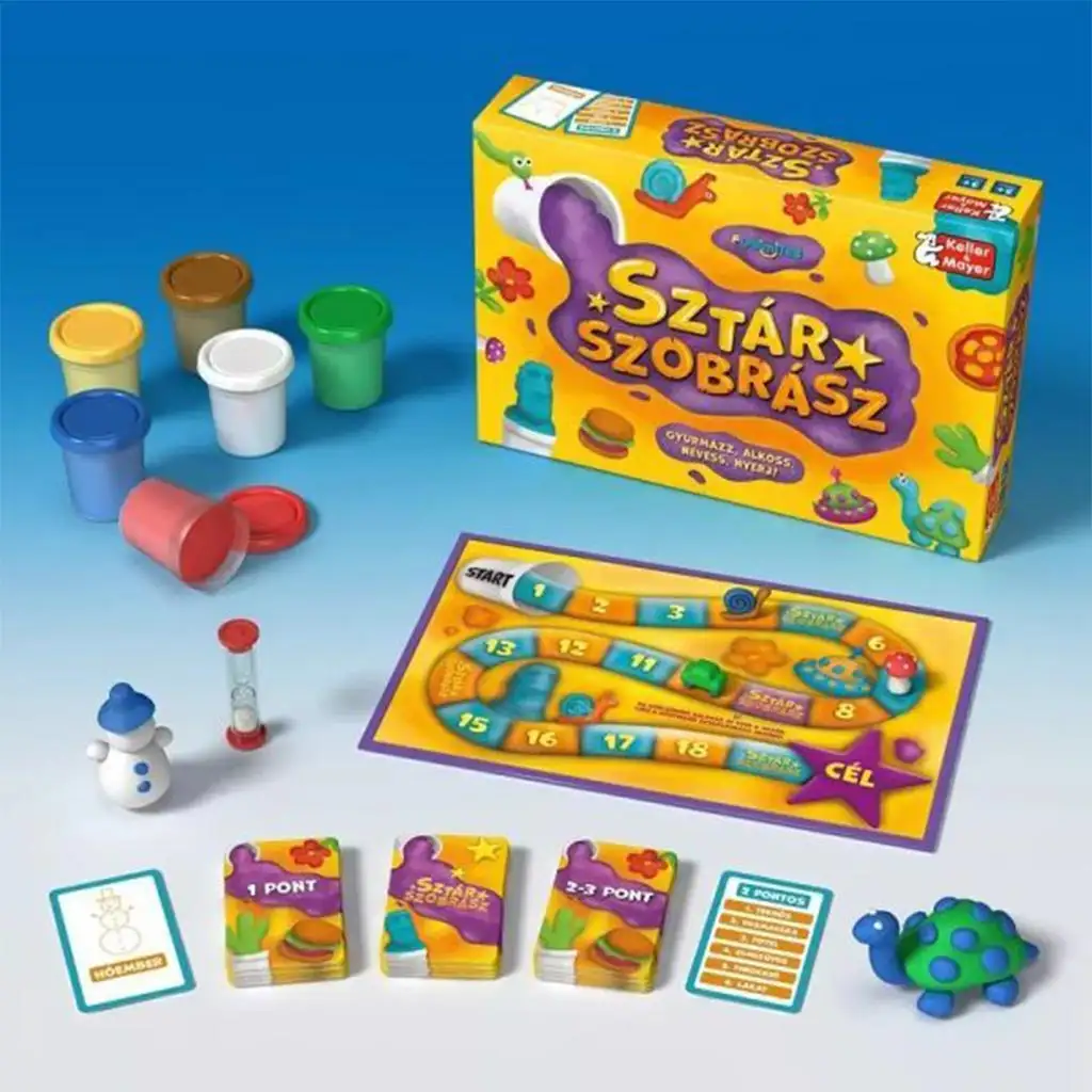 U društvenoj igri Sztárszobrász cijela obitelj može sudjelovati u zaista kreativnom i zabavnom izazovu modeliranja! Tijekom igre trebate oblikovati različite predmete, osobe ili životinje od gline, prema karticama koje izvlačite. Možete igrati u timovima ili se natjecati pojedinačno, dok se istovremeno natječete s vremenom. Savršeno je za male, jer se zadaci mogu razumjeti bez čitanja, ali za starije i odrasle čekaju ozbiljniji izazovi. Igra očarava uz pomoć šarenih glina i jamči puno smijeha i kreativnih trenutaka. Raznolikost zadatkovnih kartica osigurava da se uvijek suočavate s novim izazovima, tako da nikada neće biti dosadno. Bilo da tražite igru za sjajnu zabavu ili želite obogatiti obiteljsko poslijepodne, Sztárszobrász će biti odličan izbor.