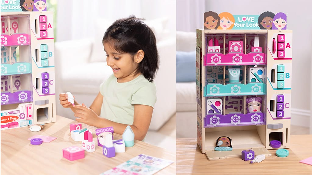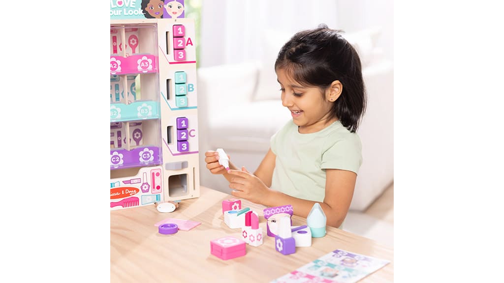 Zabava počinje tako da u stroj stavljamo ruževe, lakove za nokte, losione za tijelo, kutijice s puderom, sjenila za oči i druge proizvode za njegu ljepote, razvrstane po bojama. Zatim djeca od 3 godine i starija mogu pomoću žetona za uparivanje boja i pripadajućih gumba odabrati proizvod, a zatim promatrati kako odabrani kozmetički proizvod pada u ladicu za prikupljanje! Set se sastoji od više od 24 komada, uključujući razne igračke za njegu ljepote, žetone i višekratnu karticu aktivnosti, koja je ujedno i popis za provjeru zaliha, tako da djeci osigurava sate kreativne igre uloga. Ova igračka nije samo zabavna, već razvija i finu motoriku, prepoznavanje boja i maštu, dok se mališani mogu uroniti u svijet igre uloga.