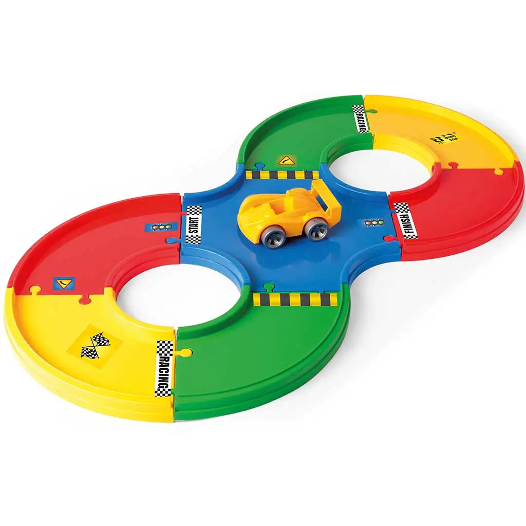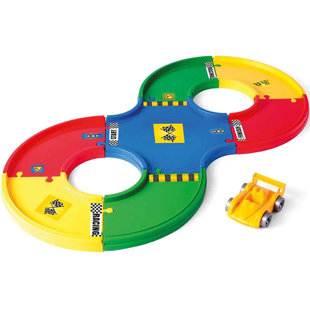 Wader Play Tracks Osnovni set brzinskih staza napravljen je za ljubitelje brzine! U ovom setu nalazi se sve što je potrebno za uzbudljivu automobilsku utrku: staza dužine 1,6 metara, jedan trkaći automobil i 36 naljepnica za potpunu prilagodbu. Elementi staze koji se lako sastavljaju osiguravaju da mali trkači budu spremni za prvu veliku utrku u nekoliko minuta. Različite boje i oznake na autostazi ne samo da pružaju vizualni doživljaj, već i kontinuirano zadržavaju pažnju djece dok razvijaju vještine spretnosti i koordinacije. Naljepnicama se može dati jedinstven izgled stazi i automobilu.