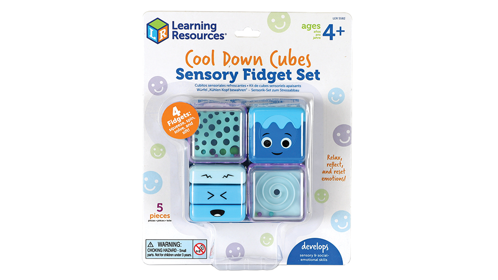 Ova četiri umirujuća senzorska kocka nude različite fidget aktivnosti kako bi pomogla djeci u obradi njihovih emocija. Djeca mogu stiskati pjenu koja se polako vraća u prvobitni oblik, vrtjeti zvrk, rješavati labirint i prosijavati padajuće perle. Kocke se mogu pohraniti u pladanj kada završi vrijeme igre.