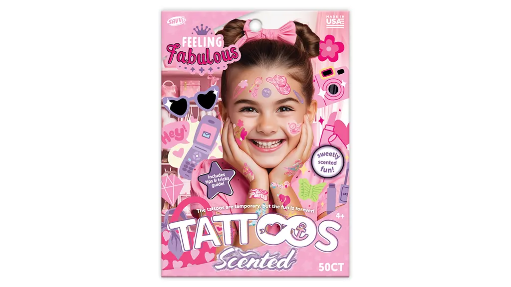 Ovaj paket od 50 komada privremenih tetovaža s mirisom šećerne vate, koje su prijateljske prema koži, može se koristiti na koži, odjeći, bocama s vodom i mnogim drugim površinama kako bi djeca mogla uživati. Paket također sadrži vodič "Savjeti i trikovi" za maksimalnu zabavu.