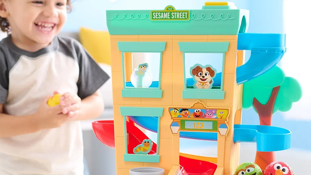 Djeca mogu spustiti svoje omiljene prijatelje iz Ulice Sezam na ovom zavojitom, višeslojnom setu za igru, postaviti tri loptice na vrh, a zatim pritisnuti žuti gumb kako bi ih pustili jednu po jednu. Svakim pritiskom na gumb Elmo izgovara smiješne rečenice ili pjeva pjesmu "Here We Go Loopty-Loo".