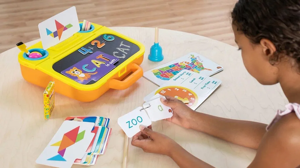 Prijenosni školski stol s vanjske strane ima magnetsku ploču, dva ugrađena držača za čaše i stalak za učeničke kartice. Djeca ga otvore i unutra pronađu magnetsku bijelu ploču, dva pretinca s poklopcima te mnoštvo pribora, uključujući kredu, magnetska slova i brojeve, magnetske tangram oblike, kartice s riječima, matematičke kartice i još mnogo toga.