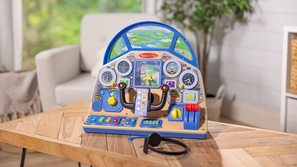 Budući piloti mogu se pripremiti za polijetanje s ovom interaktivnom kontrolnom pločom koja sadrži svjetla, gumbe, reprodukciju zvuka, četverostupanjski gas i još mnogo toga. Djeca mogu okretati volan kako bi pomicala mini-avion na pomičnom zaslonu.