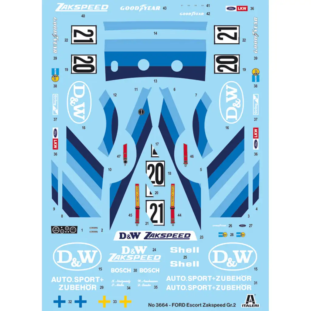 Ovaj Italeri model u mjerilu 1:24 detaljno prikazuje karakteristike Ford Escort Zakspeed Gr.2. Pažljivo izrađeni karoserijski elementi, detaljno dizajniran unutarnji prostor i autentične trkaće dekoracije vjerno odražavaju sportski izgled originalnog automobila. Model se sastoji od visokokvalitetnih plastičnih dijelova koje karakterizira precizno uklapanje i detaljna izrada.