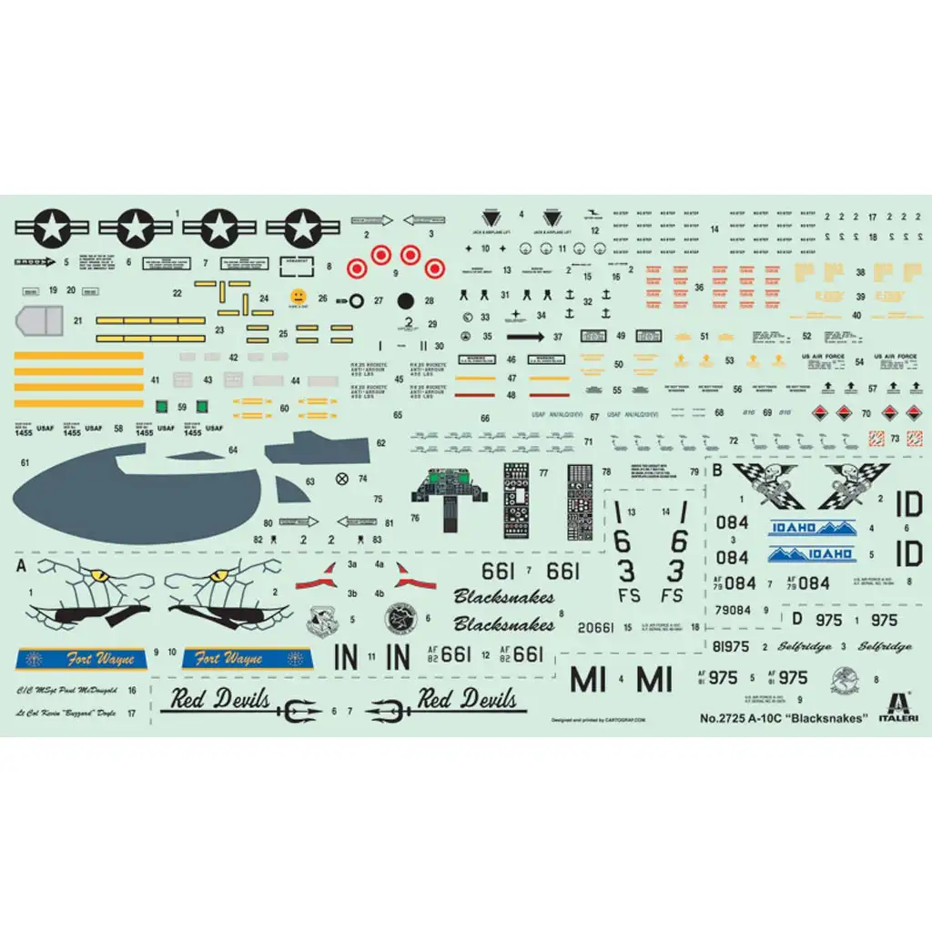 Ovaj Italeri model u mjerilu 1/48 vjerno prikazuje stvarni izgled A-10C s detaljnom izradom. Linije panela su precizno izrađene, a stajni trap, pilotska kabina i naoružanje su realistično oblikovani. Set nudi više opcija za naljepnice, uključujući jedinstvenu kamuflažu jedinice Blacksnakes, omogućujući modelarima izbor između različitih autentičnih verzija.