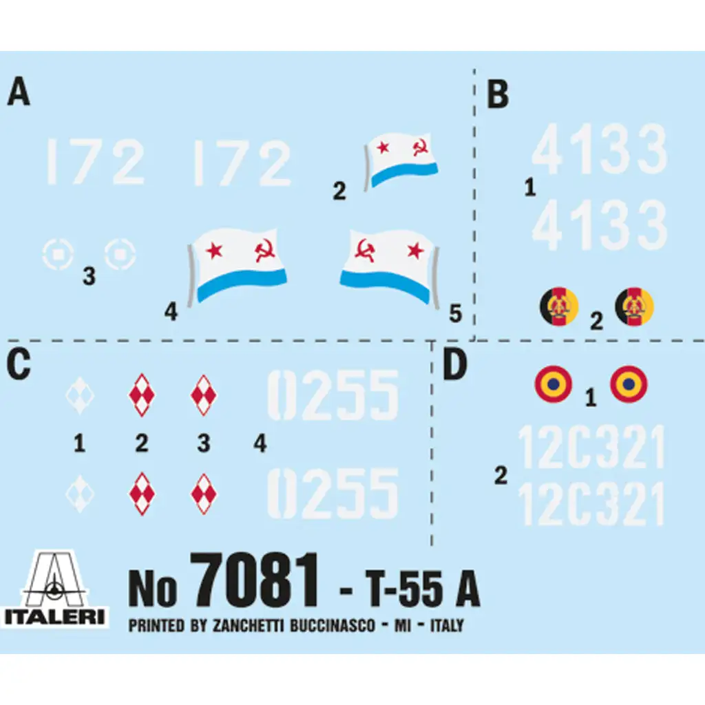 Ovo je Italeri maketa T-55A u mjerilu 1:72, izvrsne kvalitete i bogata detaljima, koja vjerno prikazuje karakteristike originalnog vozila. Set sadrži fino izrađene vanjske i unutarnje elemente, uključujući potpuno detaljan motor. Tenk ima mogućnost rotacije kupole i realistično oblikovane gusjenice, što osigurava realističan izgled. Paket sadrži četiri različite opcije naljepnica, omogućujući izradu u bojama više nacija.
