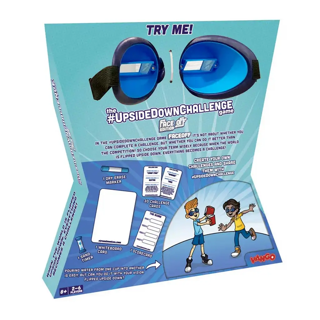 Face Off izdanje čini igru još uzbudljivijom, jer ovdje više nije pitanje možeš li izvršiti izazov, već možeš li to učiniti brže i spretnije od svog protivnika! Igru može igrati 2 do 6 osoba, pa je savršen izbor za druženja s prijateljima, obiteljske večeri ili rođendanske zabave. U kutiji ćete pronaći sve: naočale za gledanje naopačke, 30 izazovnih kartica, tablicu za bodovanje, ploču za brisanje i marker.