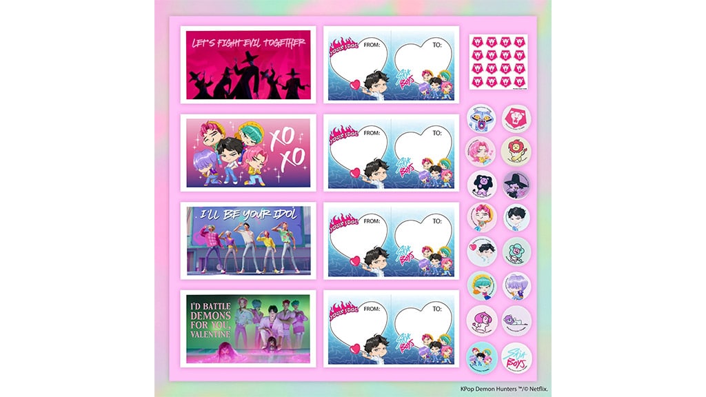 Ove godine na Valentinovo djeca mogu podijeliti svoju strast prema omiljenim bendovima uz čestitke s temom K-Pop Démonvadászok. Ovi paketi dostupni su u dva stila, HUNTR/X i Saja Boys, te sadrže 16 preklopnih valentinovskih čestitki s lijepim porukama, koje su savršene za male obožavatelje. U paketu se nalaze i naljepnice u obliku svjetlećih štapića te pokretne, 3D naljepnice, pa će ovi pokloni postati zaista posebni i nezaboravni za svako dijete koje voli svijet K-popa.
