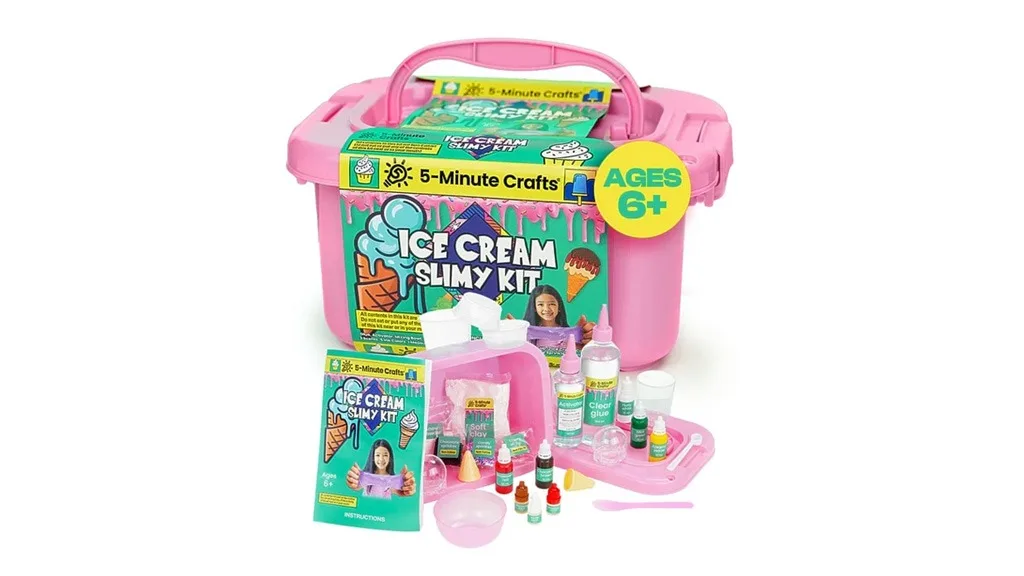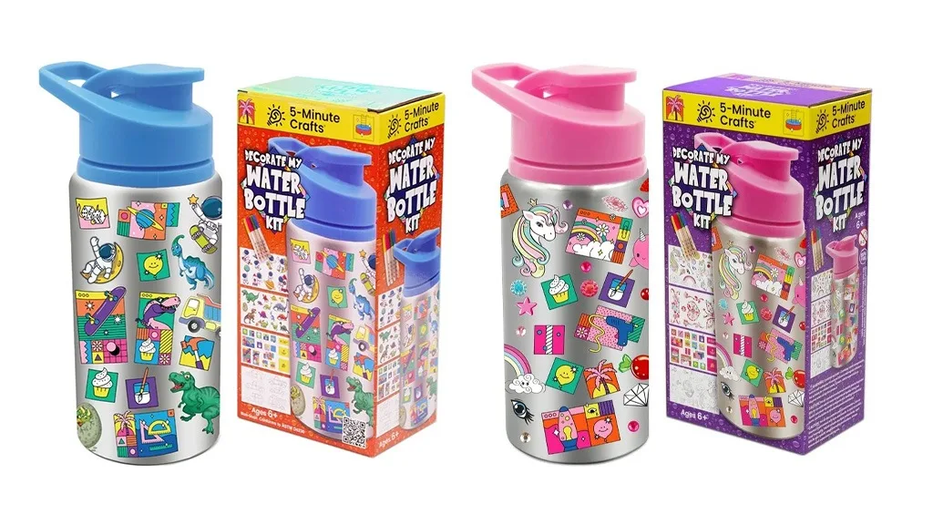 Postoji i set za izradu sladoleda od rastezljive tvari koji traje 5 minuta. Ovaj set sadrži sve potrebne alate za izradu rastezljive tvari i oblikovanje je poput sladoleda. Djeca će obožavati ovu senzornu igru dok uče znanost o stvaranju rastezljive tvari!Kolekcija uključuje dvije rukotvorine povezane s bocom za vodu, tako da vaše dijete može samo ukrasiti svoju bocu za vodu i osjećati se sigurnije nakon svakog gutljaja. U plavom setu "Ukrasite svoju bocu" nalazi se srebrna boca za vodu od 16,9 unci s plavim poklopcem, naljepnicama s dinosaurima, vodootpornim naljepnicama s astronautima, bojankama i drugim zabavnim naljepnicama. Slično tome, ružičasti set "Ukrasite svoju bocu" sadrži istu bocu za vodu s ružičastim poklopcem, naljepnicama s draguljima, vodootpornim naljepnicama s jednorozima i drugim zabavnim naljepnicama. Oba seta uključuju karabiner, naljepnice za bojanje i četiri trajna markera.