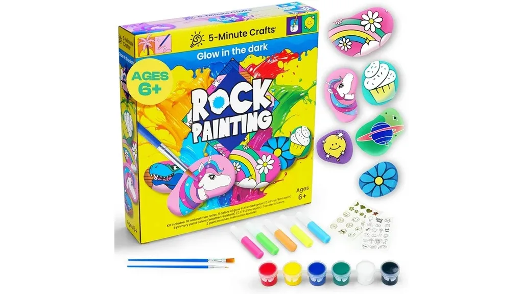 Posljednji set za obrt od 5 minuta u kolekciji je Set za slikanje stijena. Obrtnici mogu slikati 10 prirodnih riječnih kamenja s 6 boja boje i 5 boja koje svijetle u mraku. Set također uključuje četke i prijenosne naljepnice.Svaki set za ručne radove sadrži bilježnicu s uputama, ali djecu potiču da puste mašti na volju i stvore što im padne na pamet.