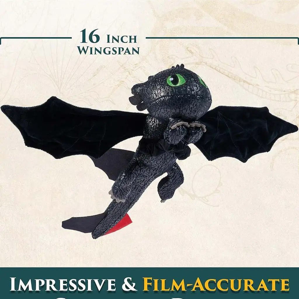 Zahvaljujući posebnom dizajnu, Bezzubi se lako stavlja na dječju podlakticu, pa može biti uz njih tijekom igre uloga ili popodnevnog gledanja crtića. Prepoznatljiv, detaljno izrađen izgled iz filma, zeleni oči, crna tekstura nalik ljuskama i slavno crveno kormilo na repu zasigurno će oduševiti sve obožavatelje. Štoviše, raspon krila od 40 cm daje plišancu zaista impresivan izgled. Savršen poklon za svakog fana Kako izdresirati zmaja koji želi vlastitog zmaja za svaki dan.