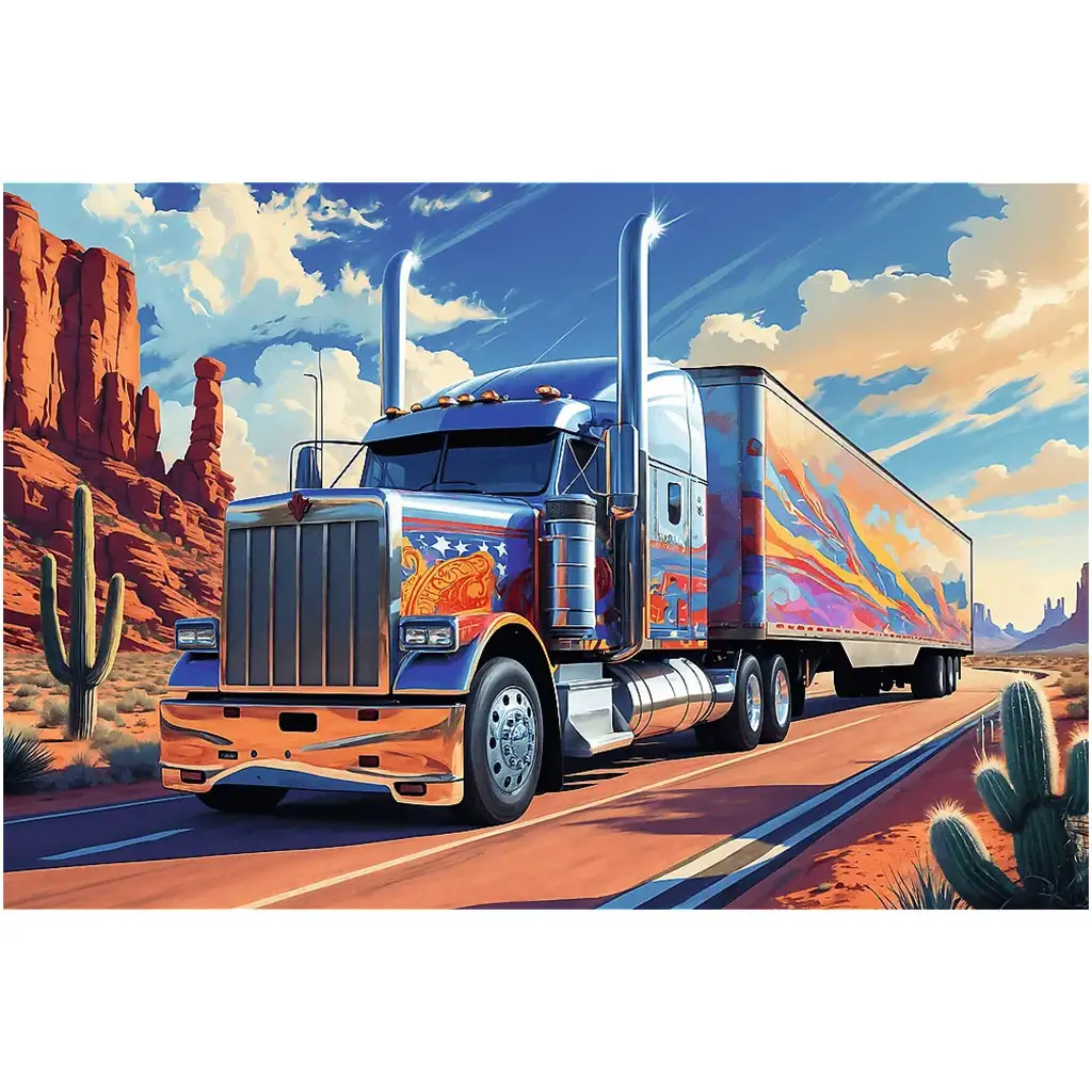 Ako je tvoje dijete zaljubljeno u snažne strojeve i uzbudljive ceste, slagalica "Kamion na cesti" bit će njegov novi favorit! Ova slagalica od 160 dijelova prikazuje impresivno oslikani kamion koji prolazi kroz pustinjski, divlji zapad pod sunčanim nebom. Ogroman američki kamion koji blista u kromiranom sjaju već sam po sebi oduzima dah, no bočno ukrašen šarenim motivima i krajolikom, slika koju slažete postaje posebno dojmljiva i atmosferična.