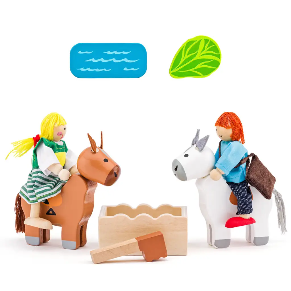 Proizvod uključuje 2 drvena konja i 2 lutke čije su noge i ruke napravljene od žice, pa se mogu oblikovati. To omogućava djeci da postavljaju lutke na konje ili unutar kabine transportera i postavljaju ih u različite položaje, kao što su klečanje, ležanje ili raširenje ruku.