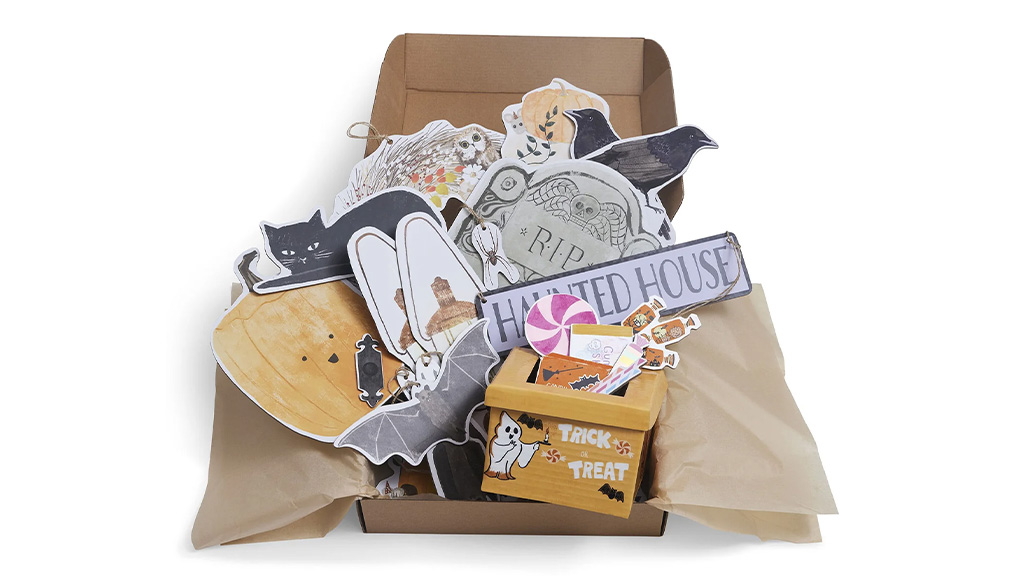 Make It Spooky – Halloween Dekoracijski Set sadrži ručno ilustrirane dekorativne elemente izrađene od održivog kartona i papira. Set uključuje vijenac, tri seta bundeva, zvono, kutiju za trik ili poslasticu s pet komada igračaka bombona, dvije lampe, dvosmjernu ploču uklete kuće (s prilagođenom stražnjom stranom), nadgrobni spomenik, tri gavrana, crnu mačku, tri šišmiša i pauka.